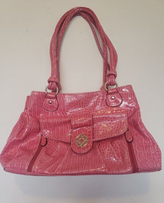 This vintage pink retro shoulder purse is the left pink that will make any outfit pop. It has a alligator pattern. Spacious 3 main compartments with magnetic closure. Mini zip pocket inside middle one, front pocket with 3 card slips, side zipped and magnetic over closure. 9x13x4