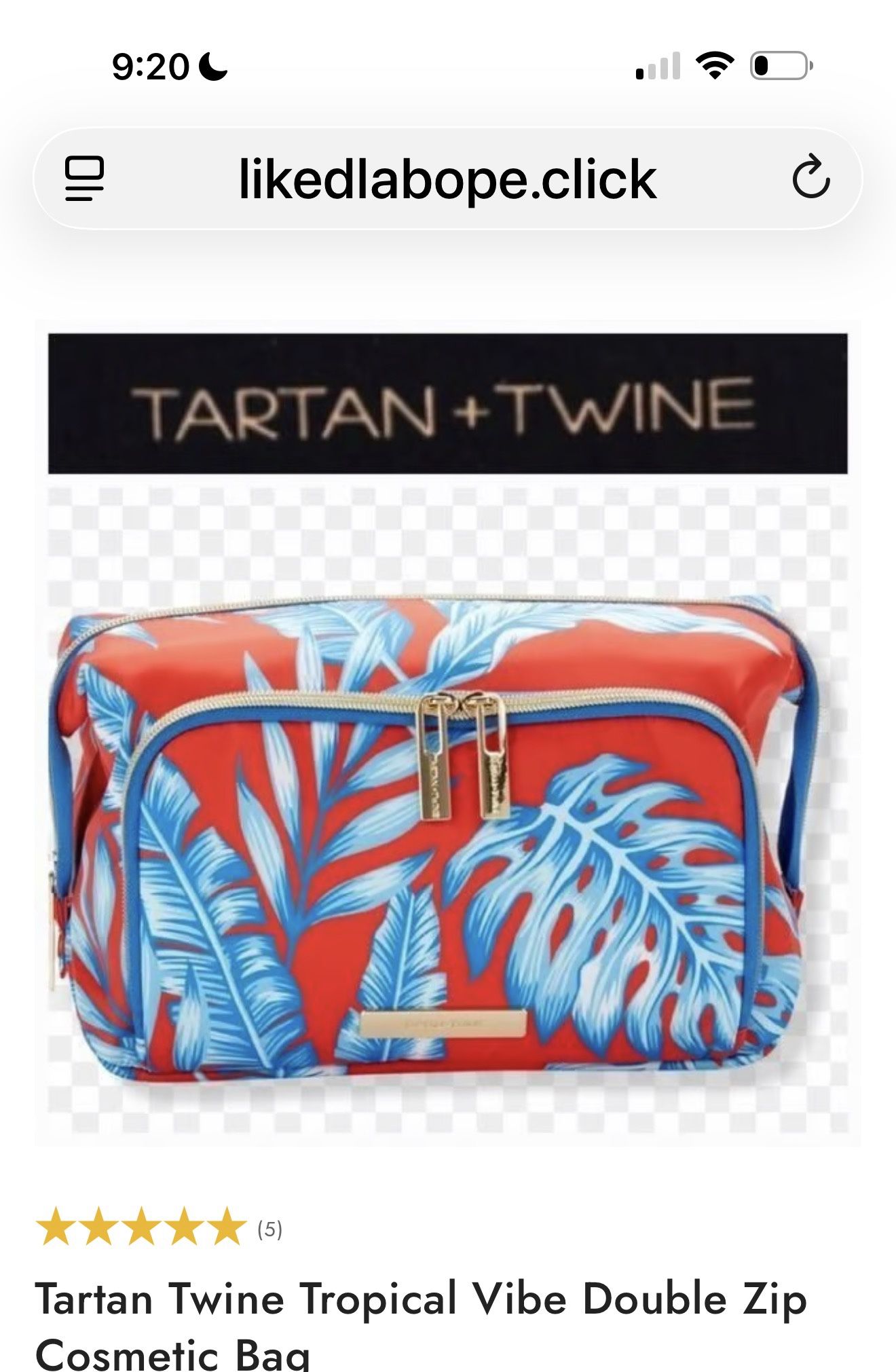 Stylish and vibrant, the Tartan + Twine cosmetic bag features a striking red and blue design. Perfect for organizing your beauty essentials with flair. #NWT #CosmeticBag #Modern #WipesClean #Vacation #HolidayMood