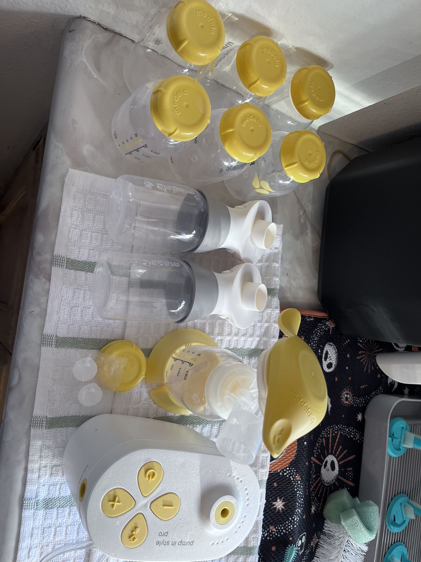 Breastfeeding supplies includes -6 storage bottles -plug in pump -hand pump Flanges not included. I bought my own flanges to fit my size. Used for a month. Have been sterilized and cleaned but you can sterilized them yourself as well