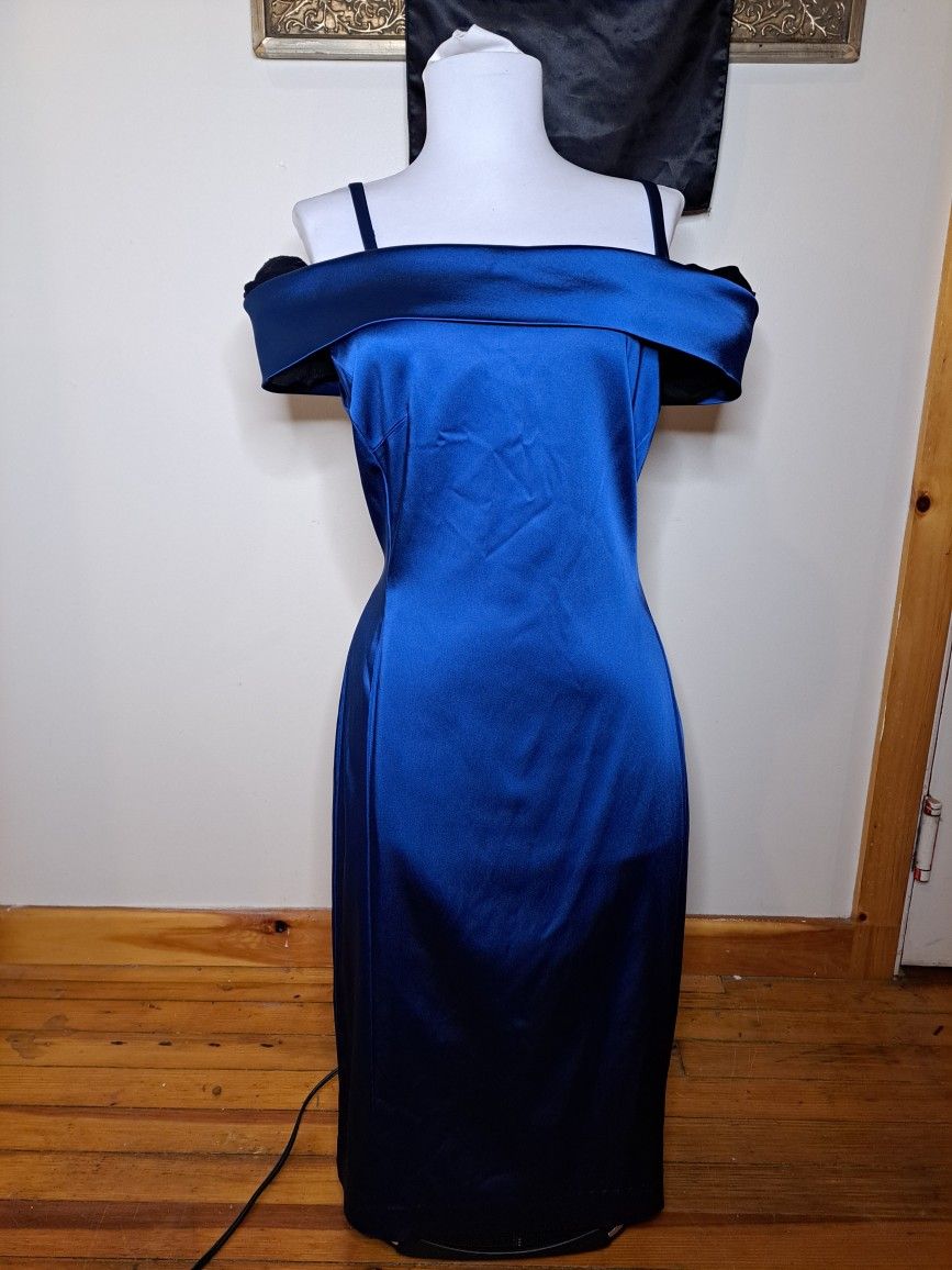 Tahari Arthur S. Levine Stretch Satin Off Shoulder Cerulean Blue Cocktail Dress Sz 8