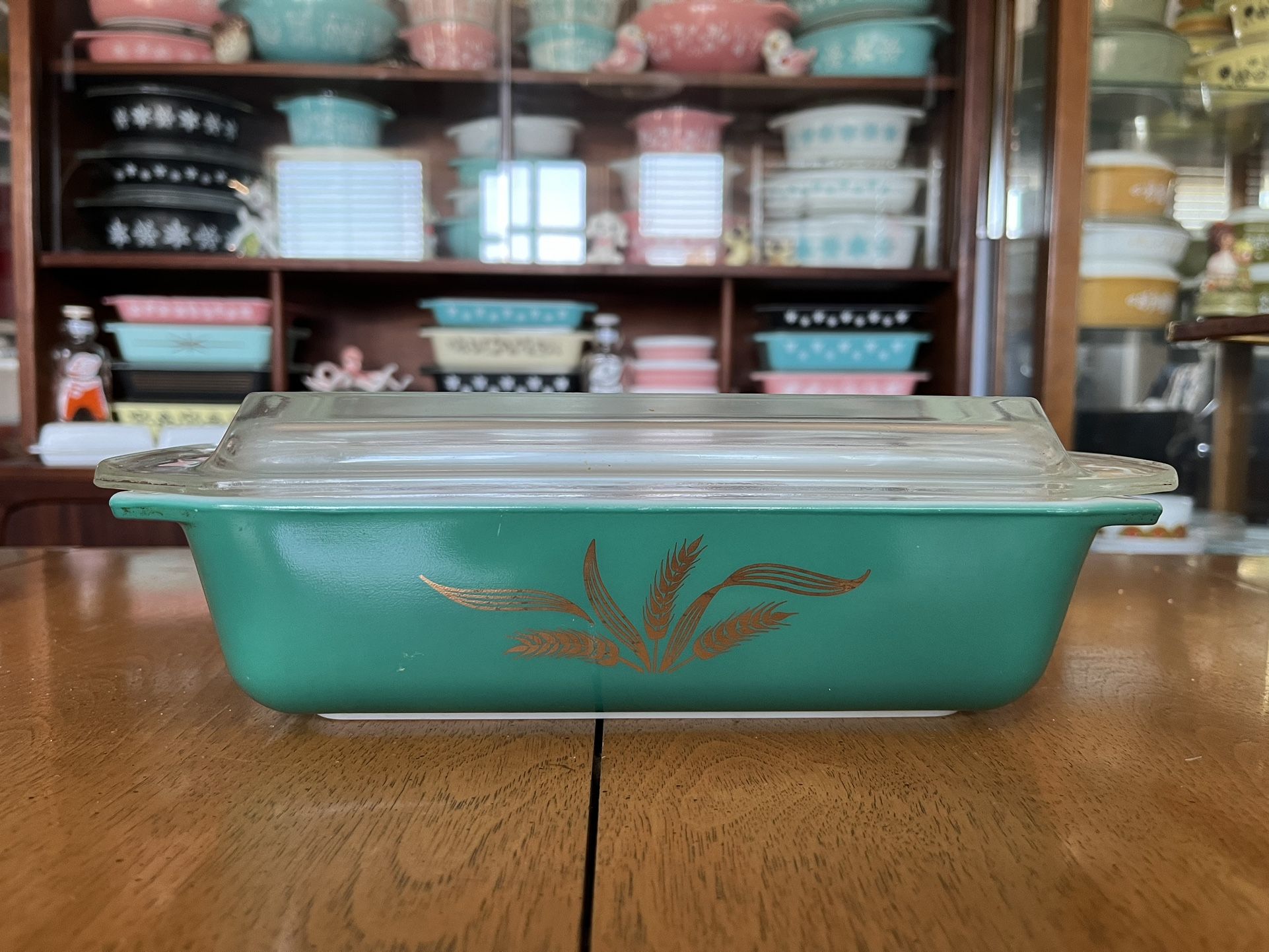 Vintage Pyrex Green wheat saver Promotional piece With lid Great vintage condition No chips, no cracks no fades Space saver lid also in great condition no chips no jagged edges