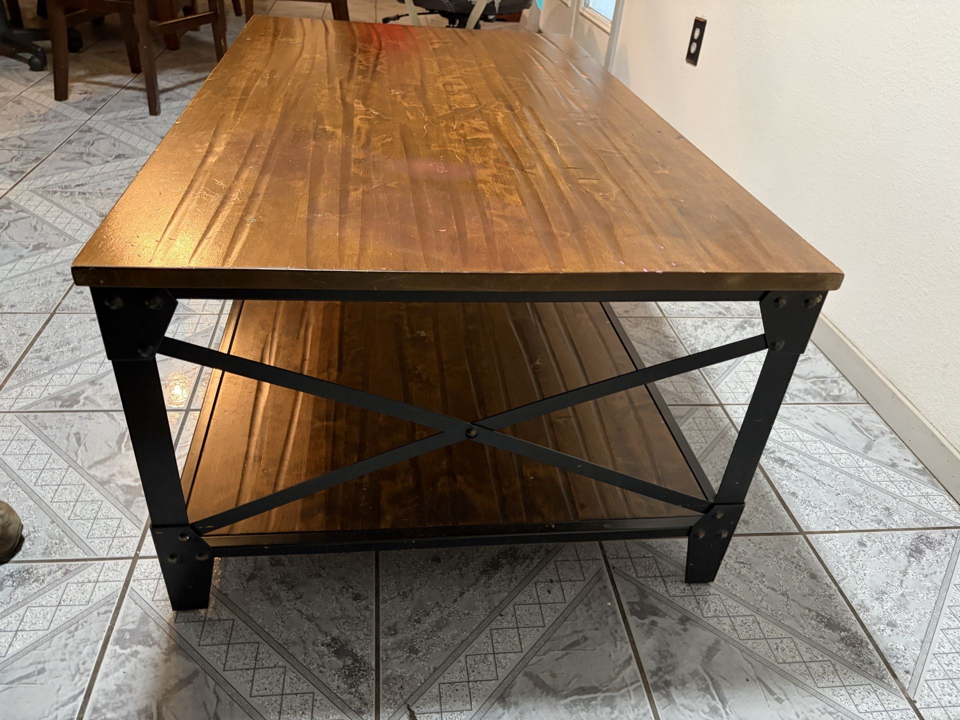 Has a few stains but hardly noticeable. Wood is in great condition otherwise as well as the metal framing, very solid and has a pretty heavy weight to it. A quick re-stain will have it as good as new.