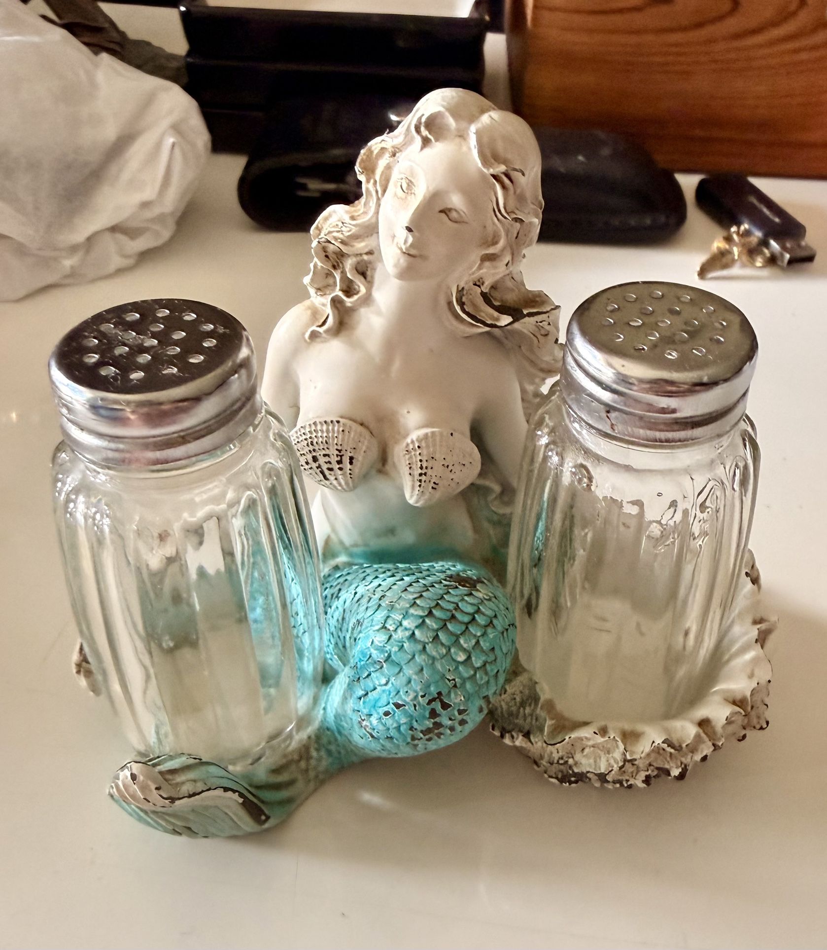 Mermaid Salt and Pepper Shaker Set. Decorative mermaid-themed salt and pepper shakers. Never used so is like New. Last picture is an example of what it sells for now. Must Pick Up.
