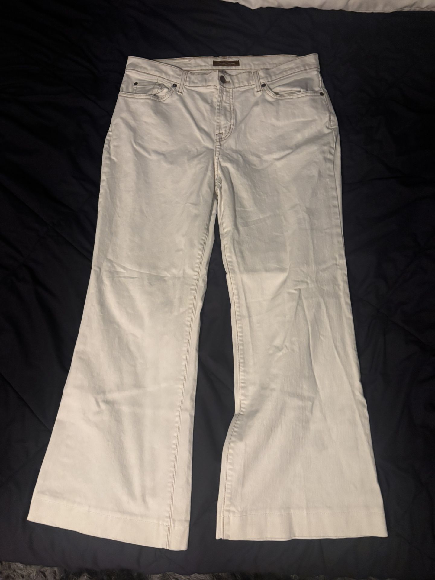 Waist 34 Length 30 Retail on these is about 60 Good material but I just don’t want them Slim at the top and flared towards the bottom with wide leg opening