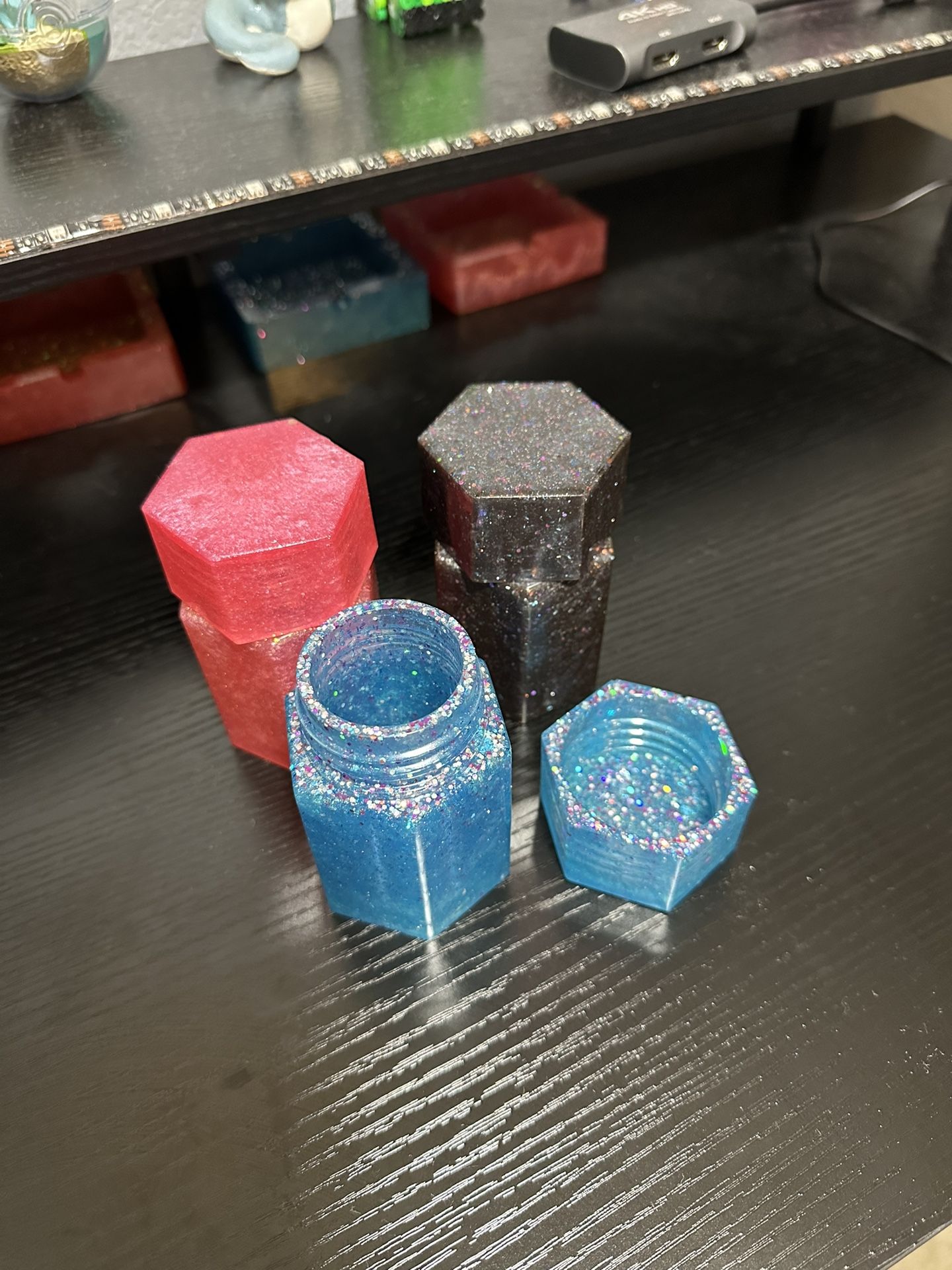 Small resin twist top jar. $10 each (3 available in this size). Comes in blue, black, and red.