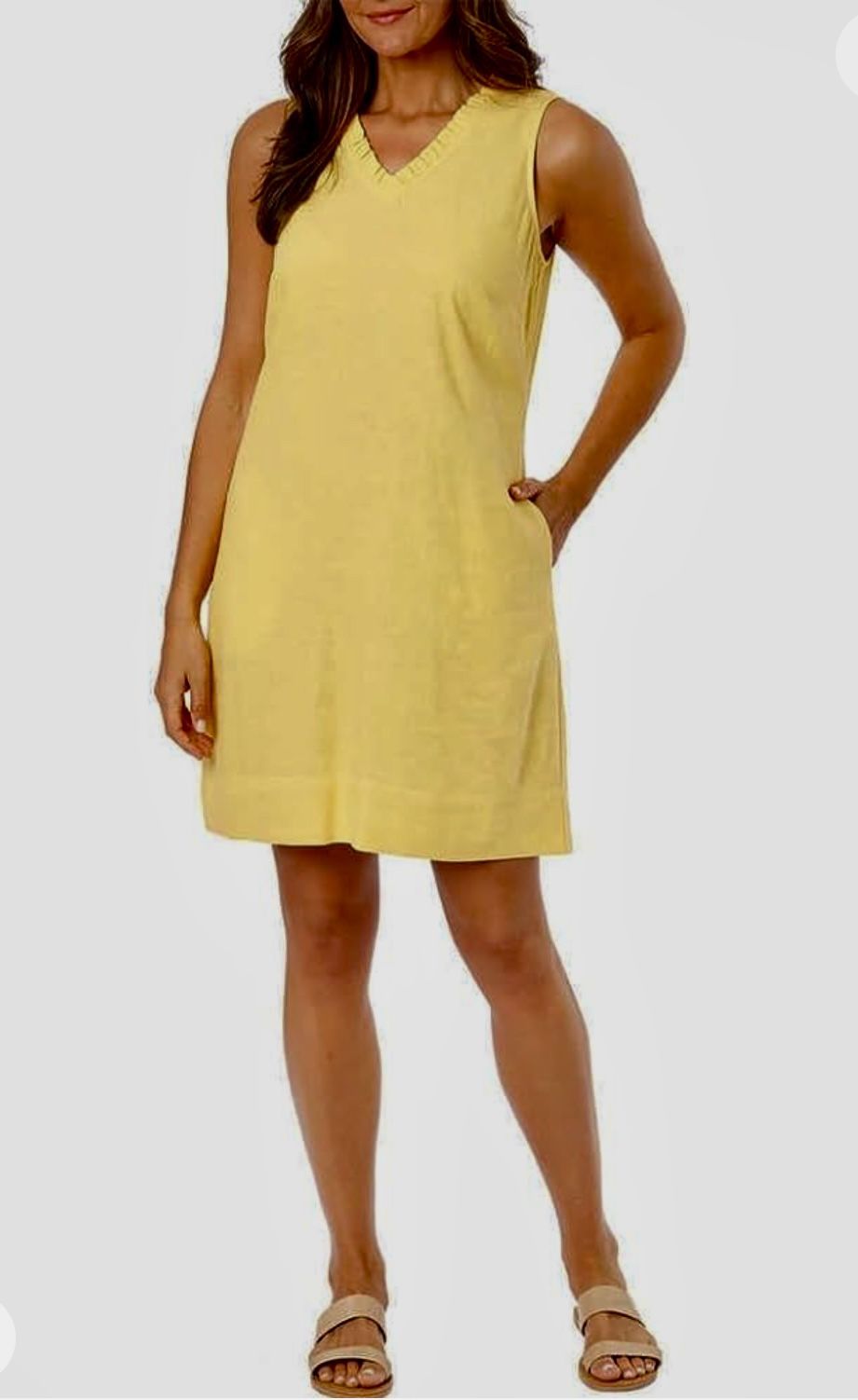 Briggs Ladies' Ruffle V-Neck Linen Blend Dress Color Yellow (Maize) Ruffle v-neck collar Side hand pockets Breathable linen blend fabric Made in Cambodia Content: 55% Linen | 45% Rayon Approximately 190 GSM Lightweight Sizing: Size Conversion: M = 8-10 Care Instructions: Machine wash cold Only non-chlorine Bleach when needed Line dry Warm iron if needed Do not dry clean