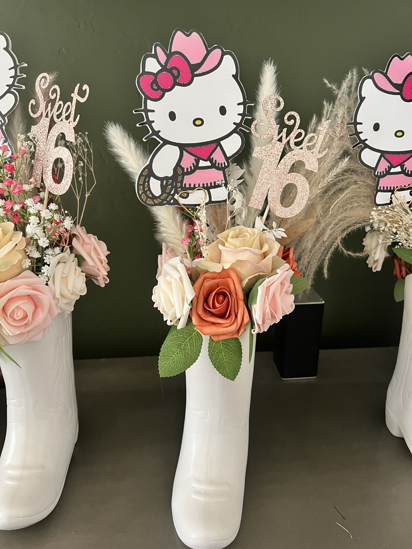 I have 6 western teamed centerpieces. Used them for a sweet 16 each was handmade. Asking $10 each. You can customize it to your liking or use as is.