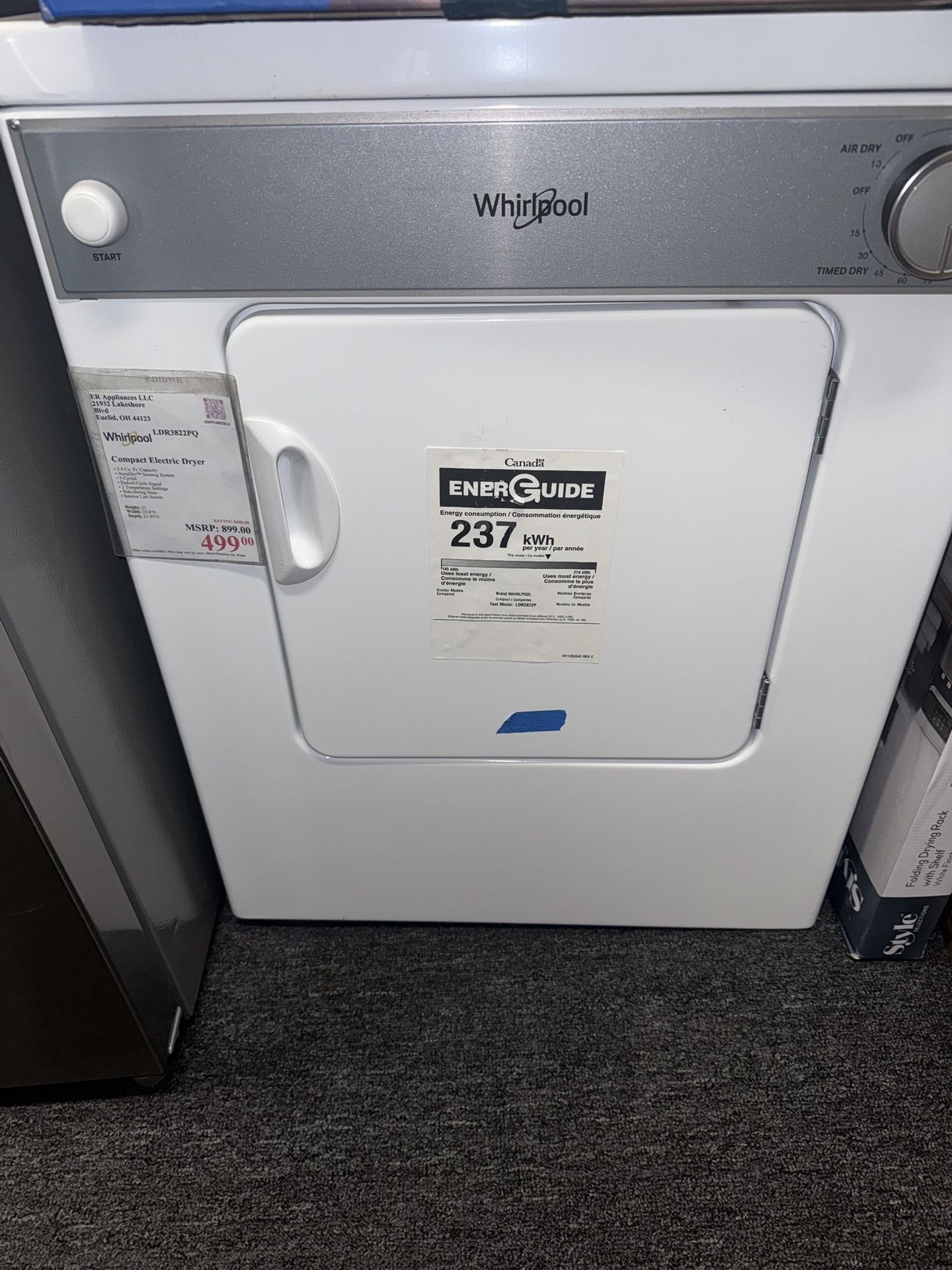 Whirlpool Compact Electric Dryer Model # LDR3822PQ • 3.4 Cu. Ft. Capacity • AccuDry™ Sensing System • 3 Cycles • End-of-Cycle Signal • 2 Temperature Settings • Side-Swing Door • Interior Lint Screen Height: 31 Width: 23.875 Depth: 21.9375 ER Appliances 21932 lakeshore BIvd Euclid, Ohio 44123 MOnday-Thursday 12-6 Friday 11-6 Saturday 11-6 Sunday closed Delivery 🚚 Same Day Next day during week Warranty Provided ⭐️⭐️⭐️⭐️⭐️Customer service Financing Available Acima, Snap Finance, koalaif|