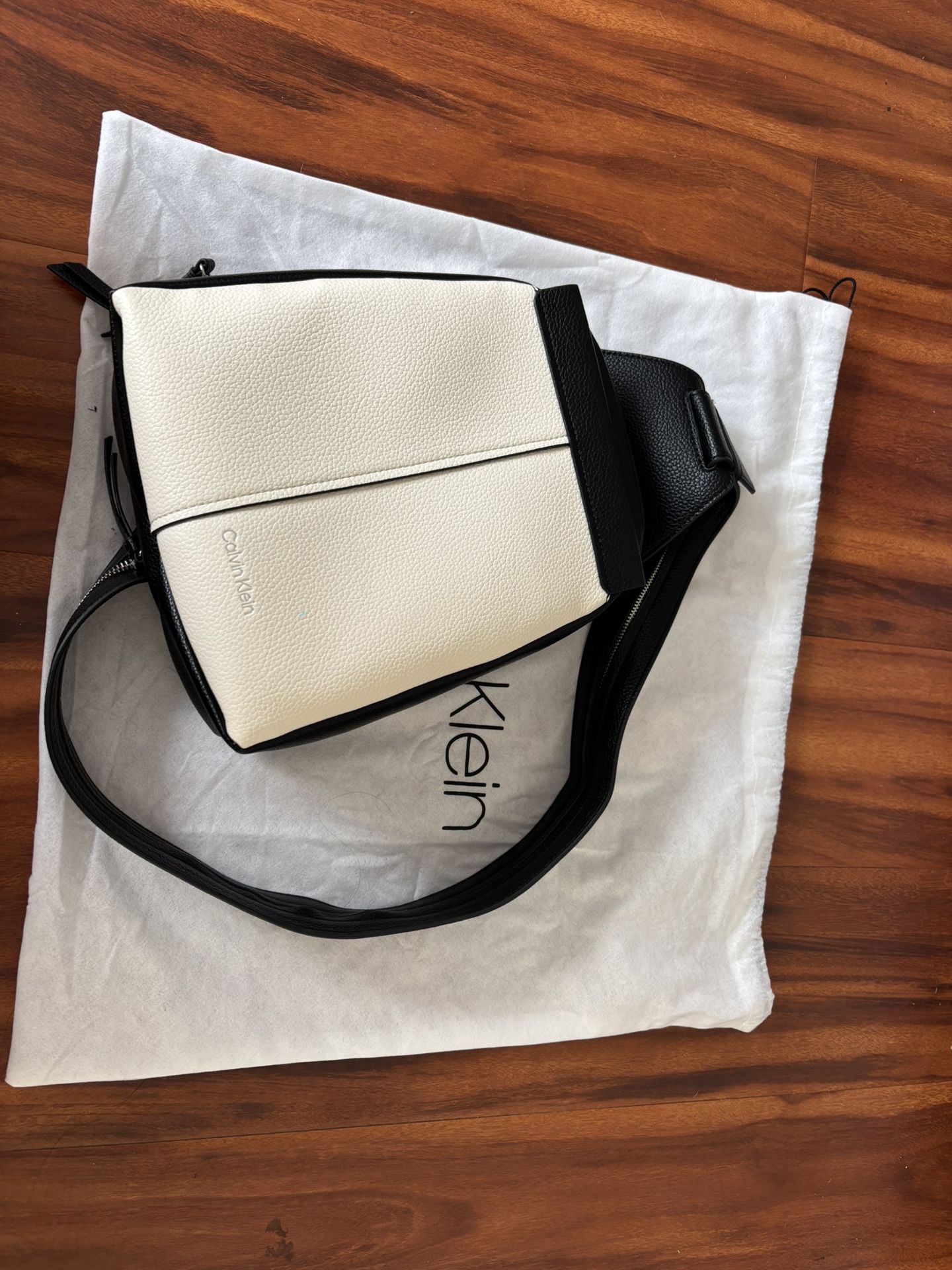 Calvin Klein mini backpack or wear as a side purse. Never used comes with dust bag for storing. Off white and black with zipper opening. $60 or better offer Pick up or drop off if near by.