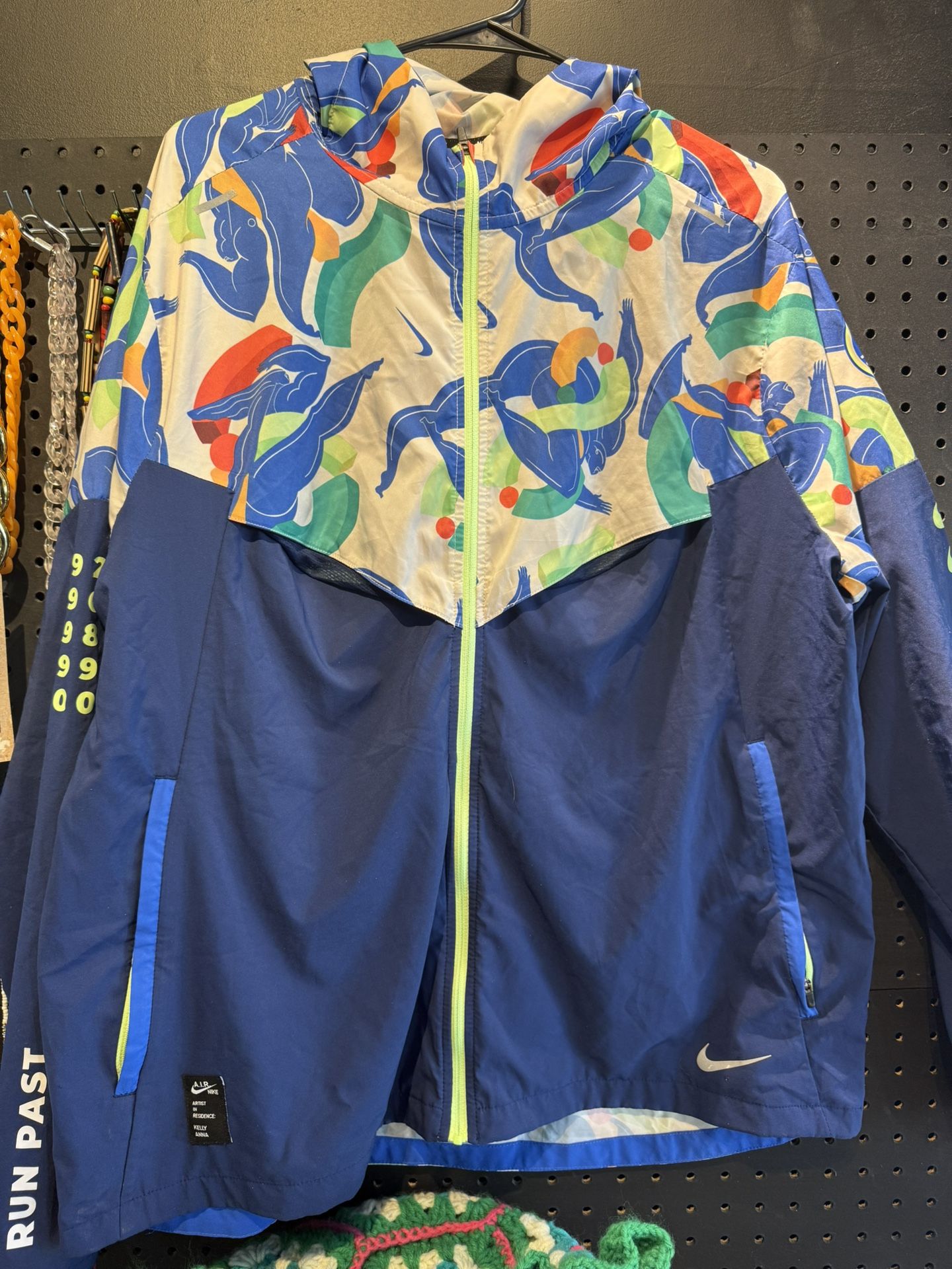 The Nike Run Past The Future Fanny Pack Jacket by Kelly Anna in size large is a rare vintage piece that combines style and functionality. This unique jacket features a bold design with a fanny pack element, adding a modern twist to a classic Nike silhouette. The multicolor pattern and regular fit make it a versatile and eye-catching addition to any man's wardrobe, perfect for those looking to make a statement with their fashion choices. #nike #jacket #sportwear