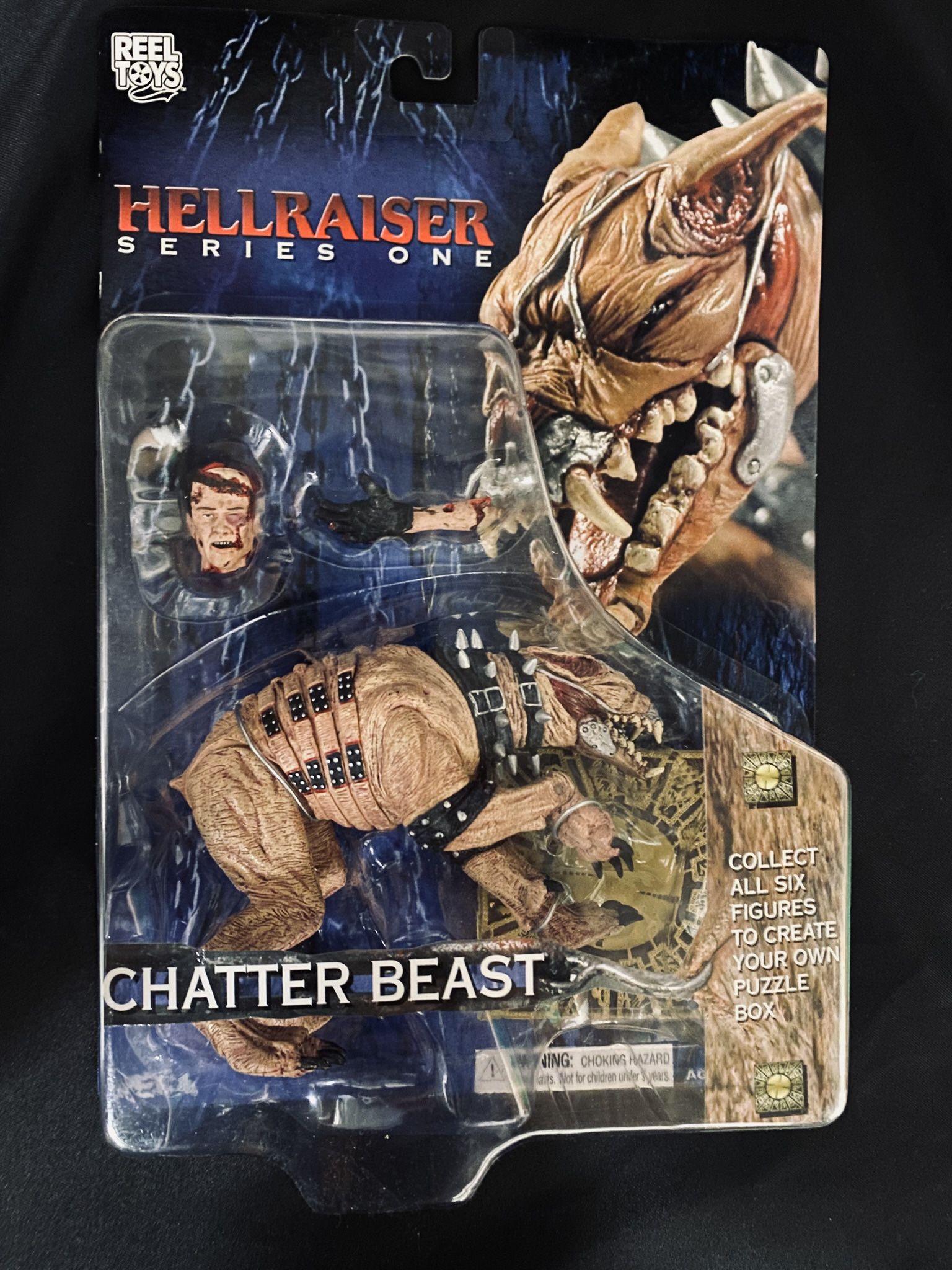 The NECA Hellraiser Series One Chatter Beast from the Hellraiser This action figure is a 1:10 scale. Released in 2003 by the brand NECA, this first edition comes with a severed head and arm, and one of six sides of a full size puzzle box that can be completed when all six figures are purchased. This figure is sealed in its original package. Card is in excellent shape with minimal shelf wear. See photos No shipping. Pick up LaGrange Park. Cash