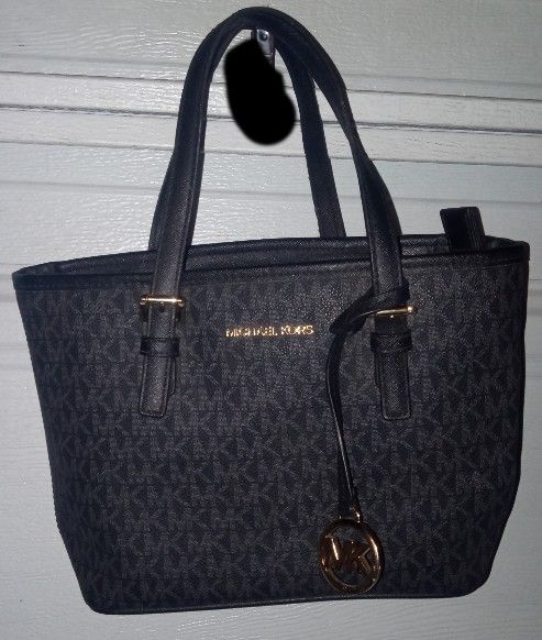 Like new Michael kors purse Michael Kors XS Carry All Jet Set Travel Womens Tote Authentic Michael Kors, dust bag NOT included Inside slip and zip pocket, top zip closure Logo-print canvas, Gold-tone hardware, Polyester lining