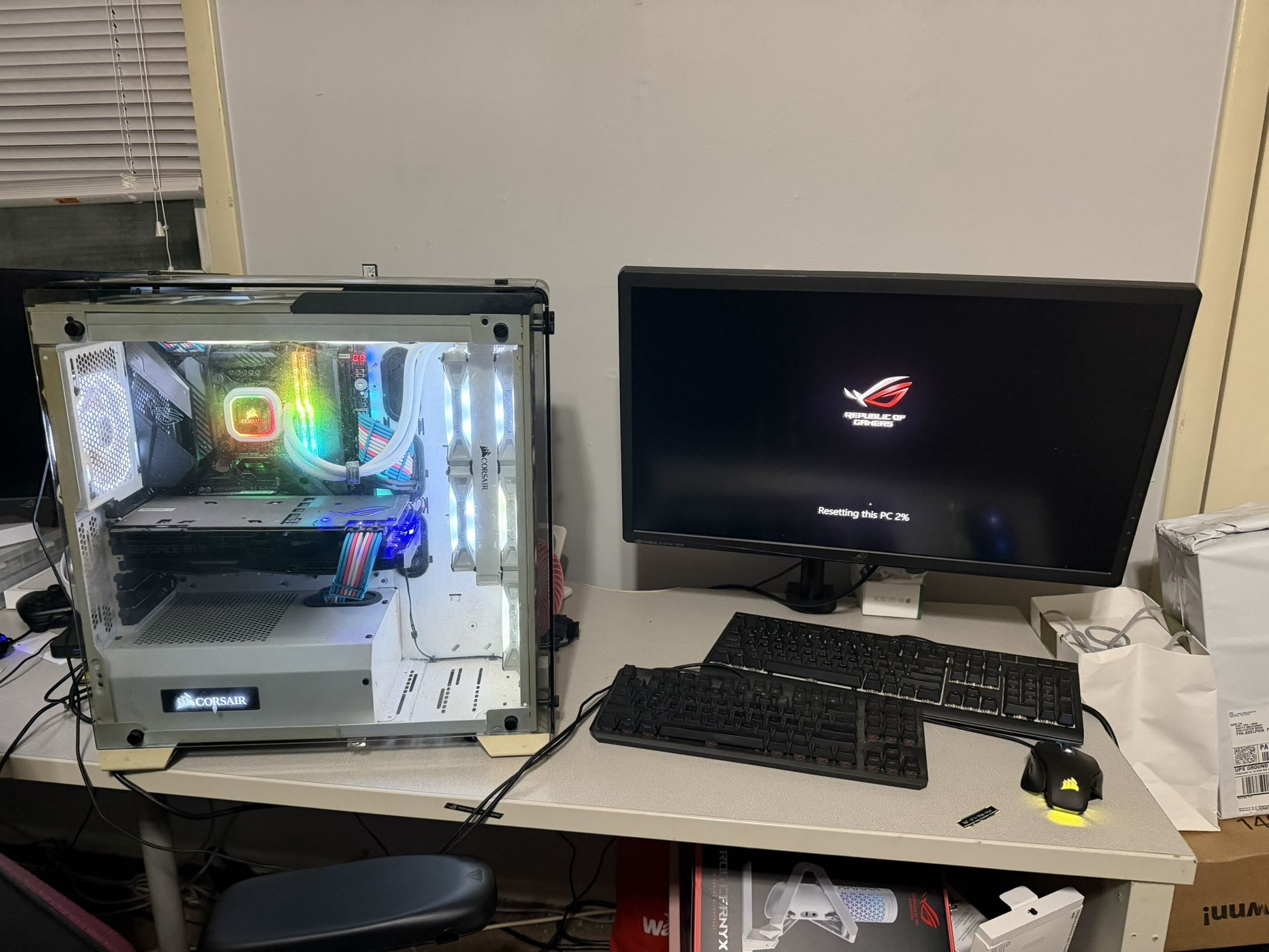 I5 9600k Asus Strix 2080 32gb 3200 c16 trident z royal 1tb Samsung 970 evo m.2 Asus Maximus xi gene Corsair crystal case tempered glass (I have the back glass for the pc just missing screws for it doesn’t affect which can be purchased from corsairs website) Pc has recently been reset and includes windows It is dusty but still works fine, it just sat for 2 years since i had a baby recently. Boot time is about 40 seconds to desktop. Performs well. Does not include mouse and keyboard. Monitor is optional.