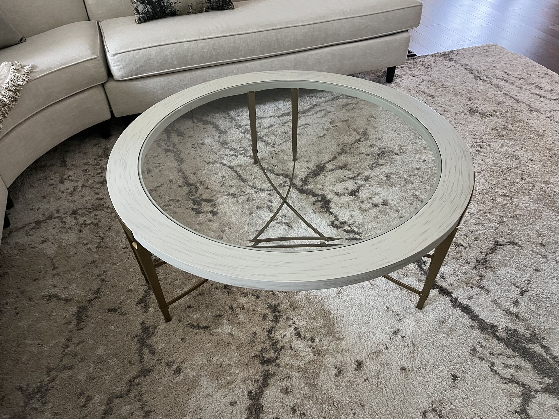 44” glass, metal and wood coffee table. Like new condition. Paid $1k for it.