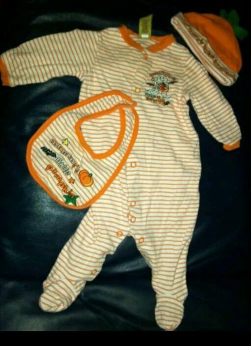 9 months Halloween onesie, hat and bib. Mummys little pumpkin one piece with bib and hat. Halloween. Pick up downtown theater district