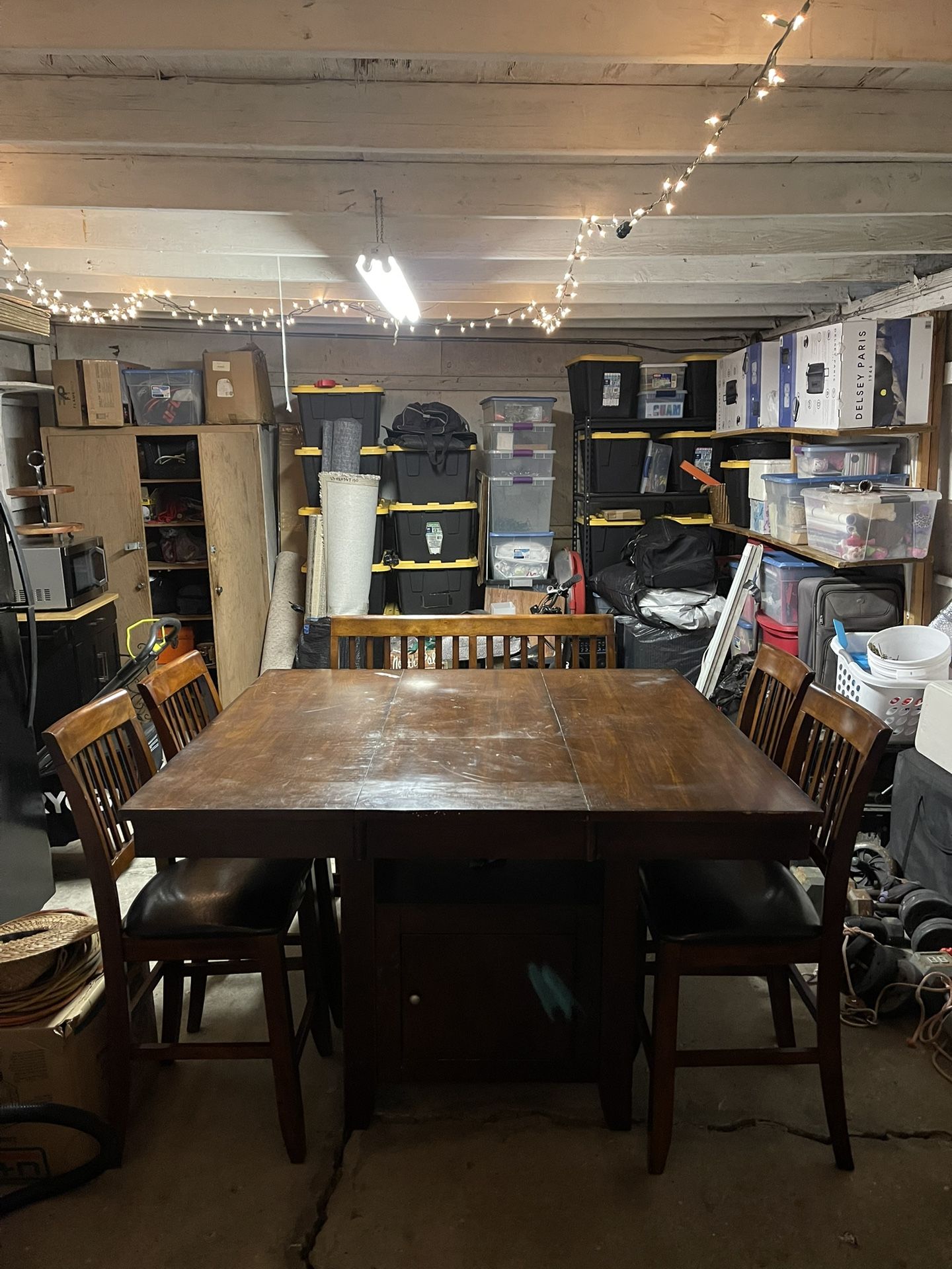 Solid Dark wood table with 4 chairs 1 Bench Table has bottom drawer . Has some heat stains on top and some light scratches, table is heavy duty and in good condition