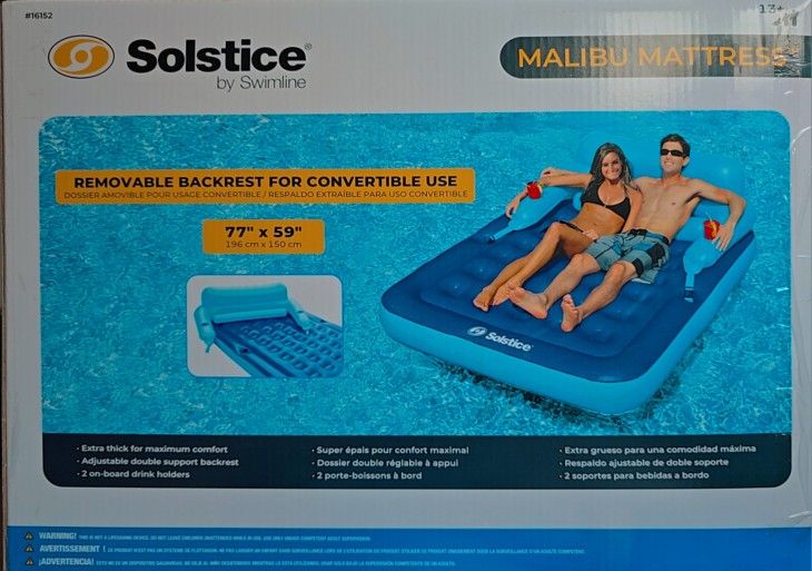 Size: 77" x 59" (196 cm x 150 cm) Removable backrest: For convertible use as a lounger or flat mattress Comfort: Extra thick for maximum comfort Support: Adjustable double support backrest Convenience: Two on-board drink holders Material: Heavy-duty vinyl