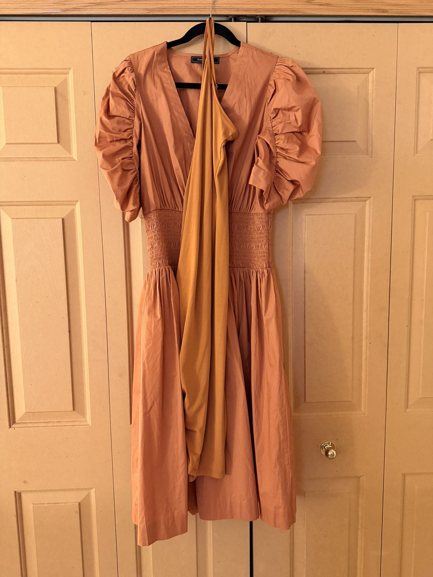 This dress has never been worn as the sleeve are on the slim side. It’s a beautiful rustic orange shade BCBG dress with a cinched waist and mid length.