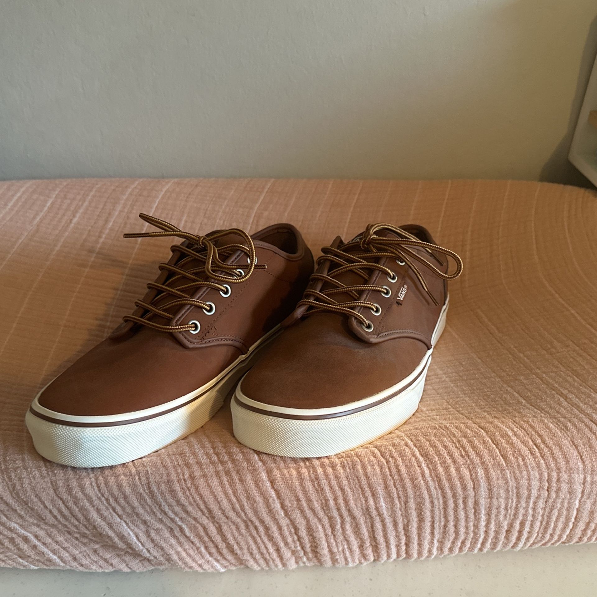 These are brand new, never worn. Size 11 brown leather classic vans shoes. $25