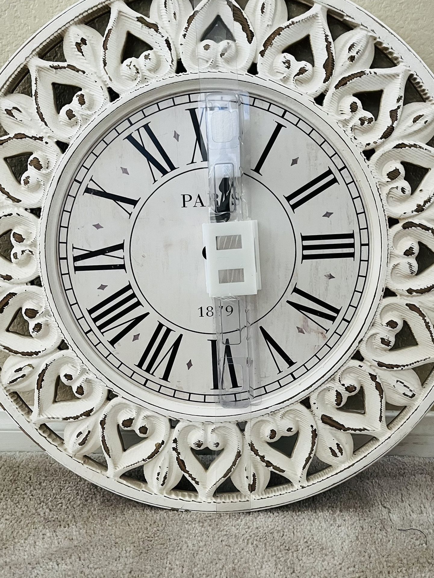 Beautiful white rustic wood wall clock never been used, still has tags. Requires 1 AA battery 23 inches in diameter Located in Green Valley