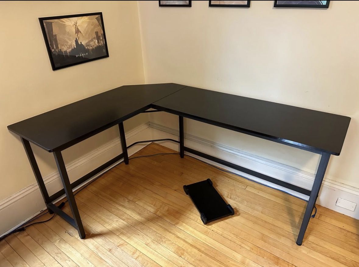 L-shaped, all black desk in great condition. Originally purchased new in 2024 for $169.99. Full details, including precise measurements, can be found on the original Amazon listing: https://offerup.com/redirect/?o=aHR0cHM6Ly93d3cuYW1hem9uLmNvbS9kcC9CMDFITzdPNDBJP3JlZl89cHB4X2h6b2RfdGl0bGVfZHRfYl9mZWRfYXNpbl90aXRsZV8wXzAmdGg9MQ== (Note that the listing shows a different colorway, but it's the same model). Includes matching computer tower stand. The desk is sturdy, spacious, and in great shape--I’m only selling it because I need a different color. Has a small chip side of desk not visible Fully assembled, but i can partially disassemble it for easier transportation upon request.