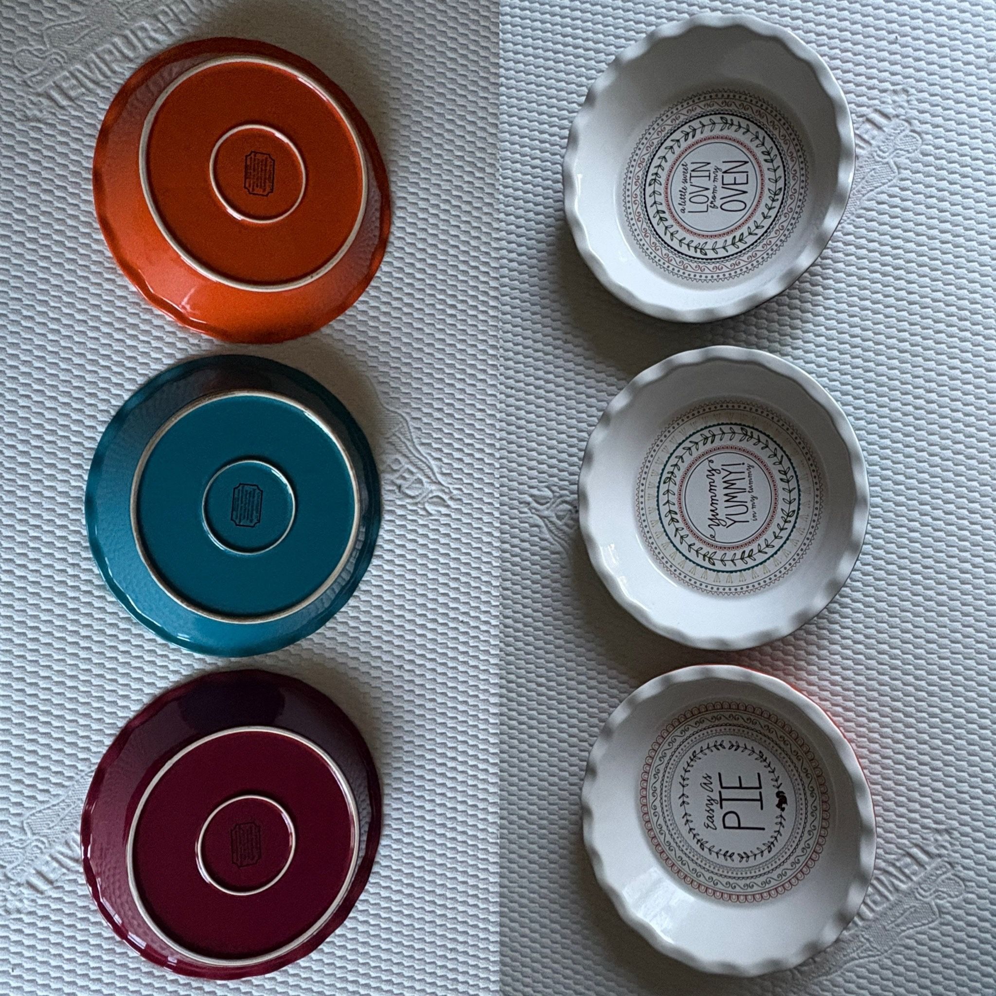 Cute set of 3 pie plates. Has vibrant orange, teal, and burgundy colors on the outside. White inside with fun sayings. One has "a little sweet lov'in from my oven." Another has "yummy! in my tummy." The third has "easy as pie." Scalloped edges. Includes: -set of 3 pie plates -set of 3 display stands -set of 4 leaf molds/cutouts Total retail $95