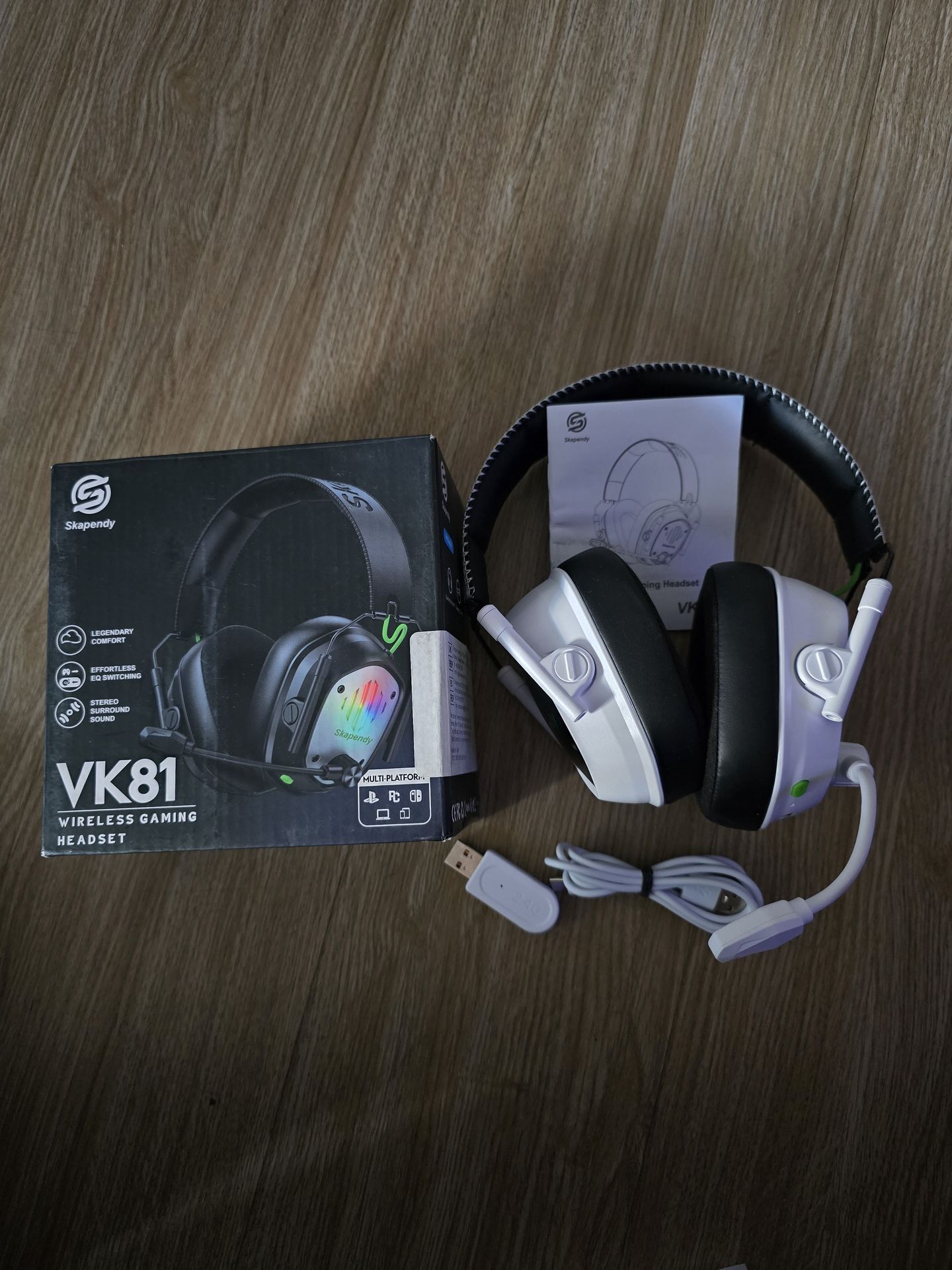 Skapendy VK81 Wireless Gaming Headset Connectivity: Features 2.4GHz wireless via USB dongle and Bluetooth 5.2. Audio: Equipped with 50mm drivers for 3D stereo surround sound. Compatibility: Designed for PC, PS4, PS5, Switch, and Mac. Features: Includes a noise-canceling microphone and RGB lighting. New in Box Pickup in San Bernardino