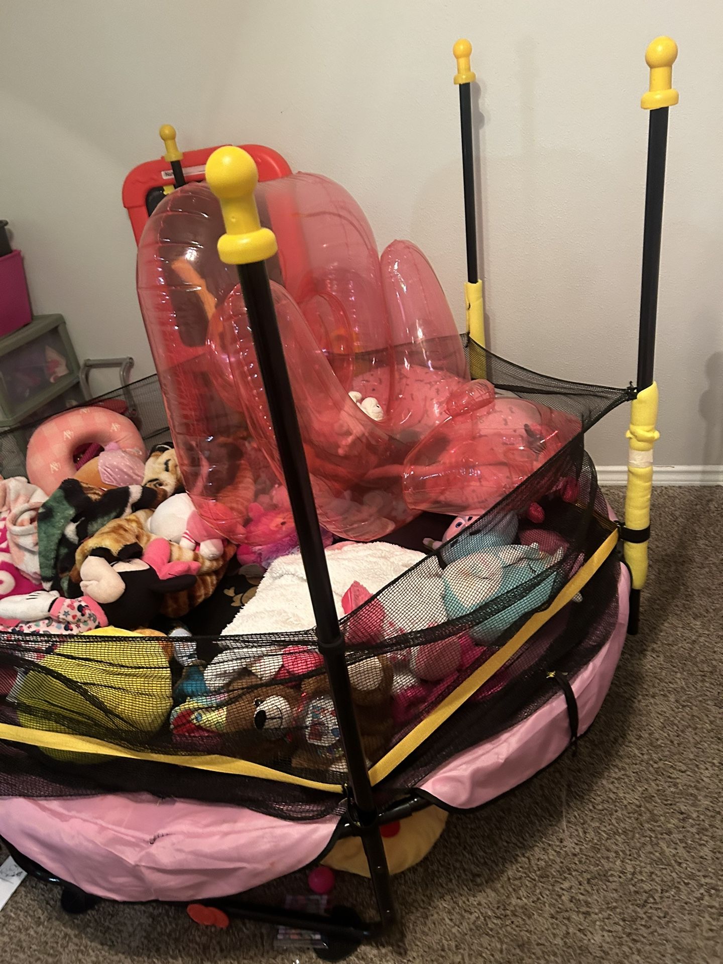 Small toddler indoor trampoline big enough for 2/3 toddlers to jump on it .