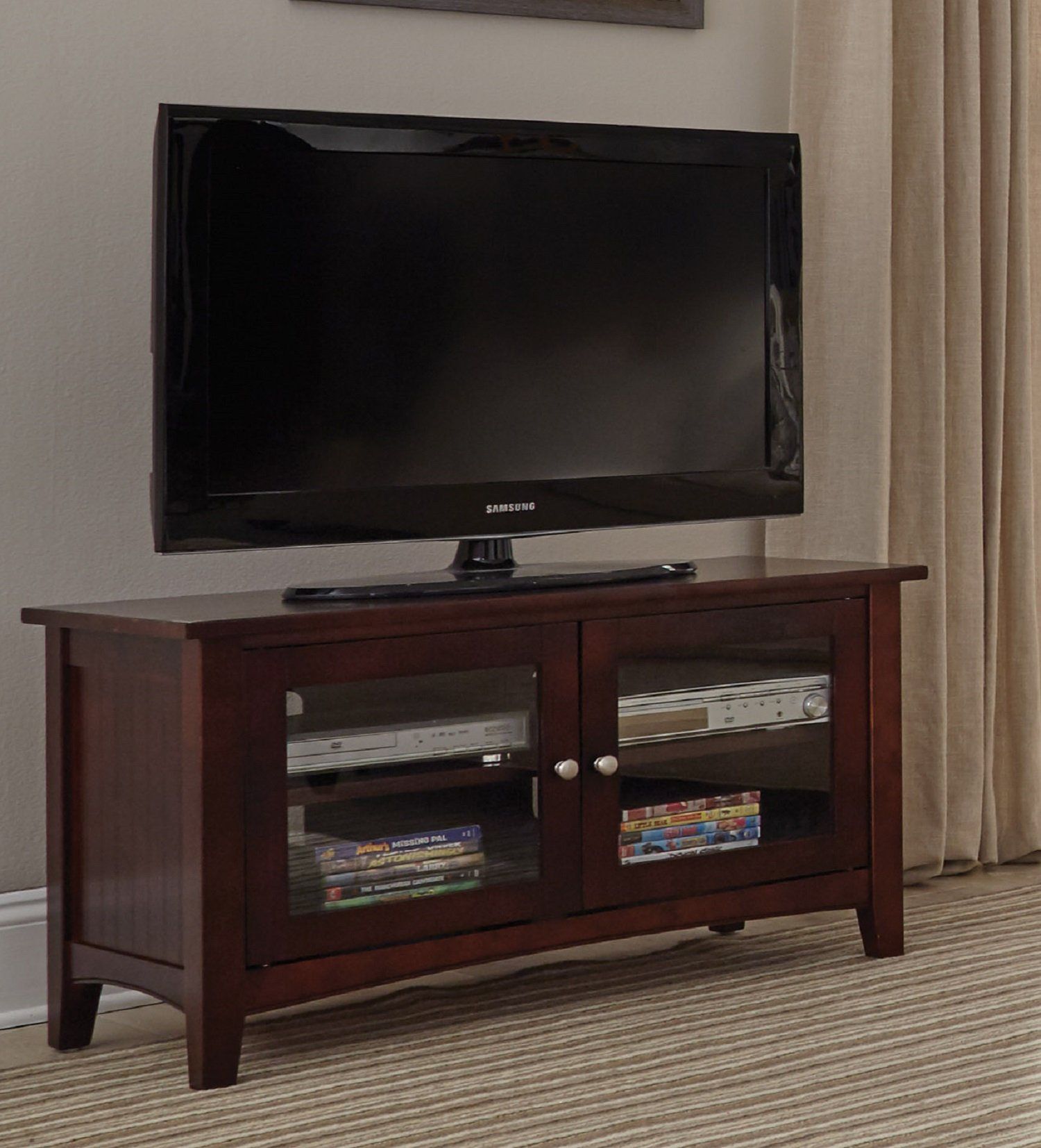 TV Stand color Espresso, new in the box About this item Update your living room with this stunning aprroved Alaterre Shaker Cottage TV Stand; constructed of select hardwoods and composite wood for lasting durability and featuring a glass cabinet with two shelves for components. Assembled dimensions: 36" W x 16" D x 20" H; Shelf is 27.5" W by door opening x 12" D; 33" total interior width; 1 adjustable shelf; bottom of cabinet is 13" D; opening in back for cords [Easy to Clean] Keep things neat and tidy; wipe clean with a dry cloth includes brushed nickel hardware for a modern look. 73210