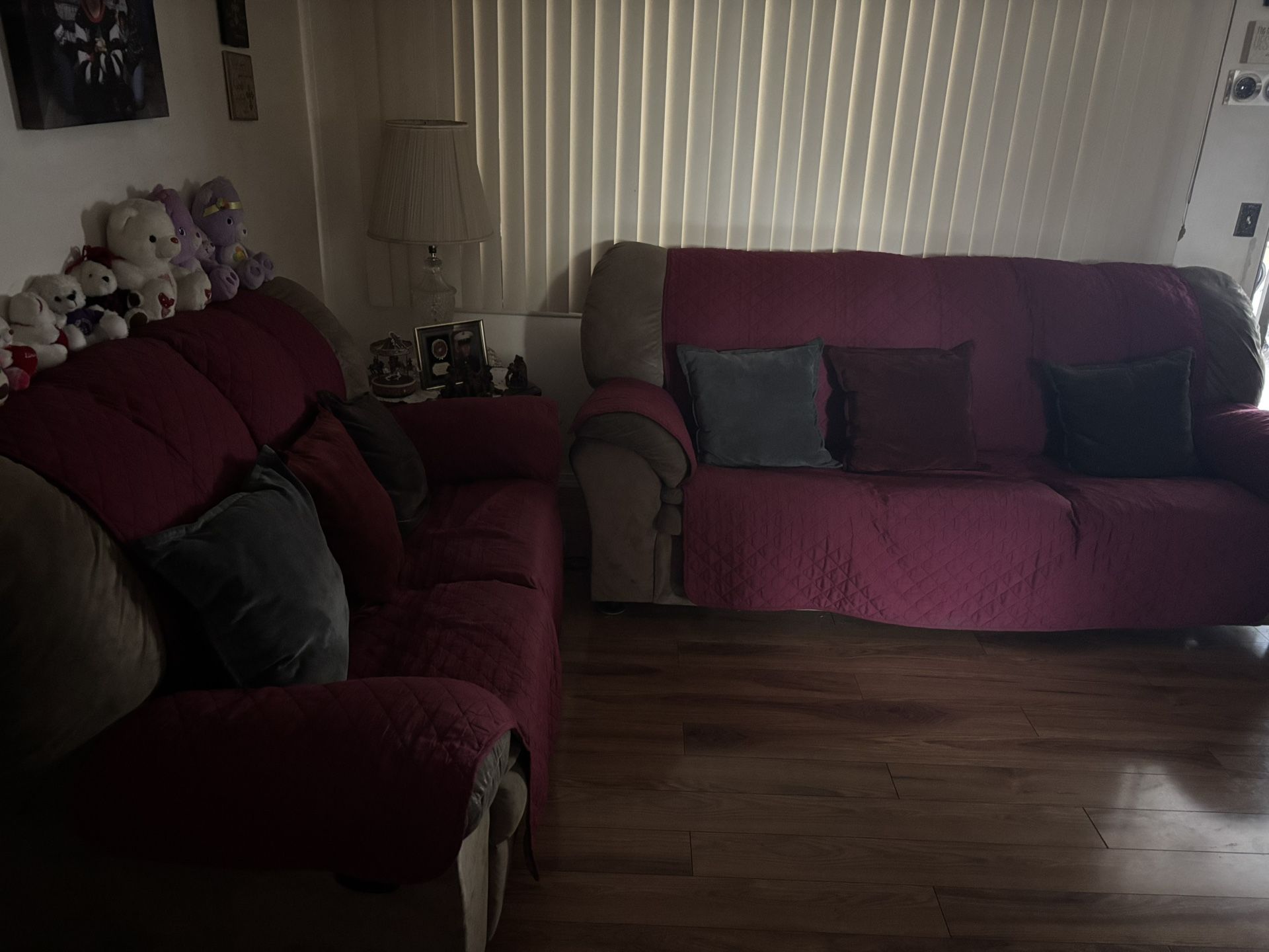 2 Beige couches. Small one is 67.5in wide. Large one is 90in wide. Red cover and throw pillows not included. Pickup only on Saturday morning.
