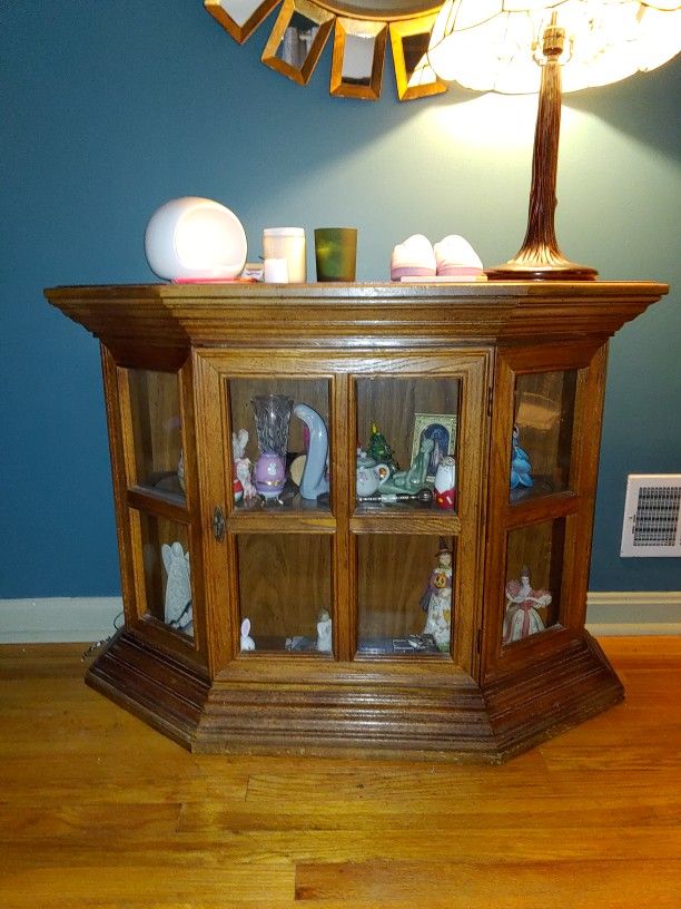 This small credenza/display case would look wonderful in your living room or entryway. Size is 42" wide in the back, and 20" wide at the front; 15" deep and 30" high. Glass front and sides so your cherished items are visible. The front opens for easy access, and there is an internal light to show off your items. 25% off through Nov. 30!