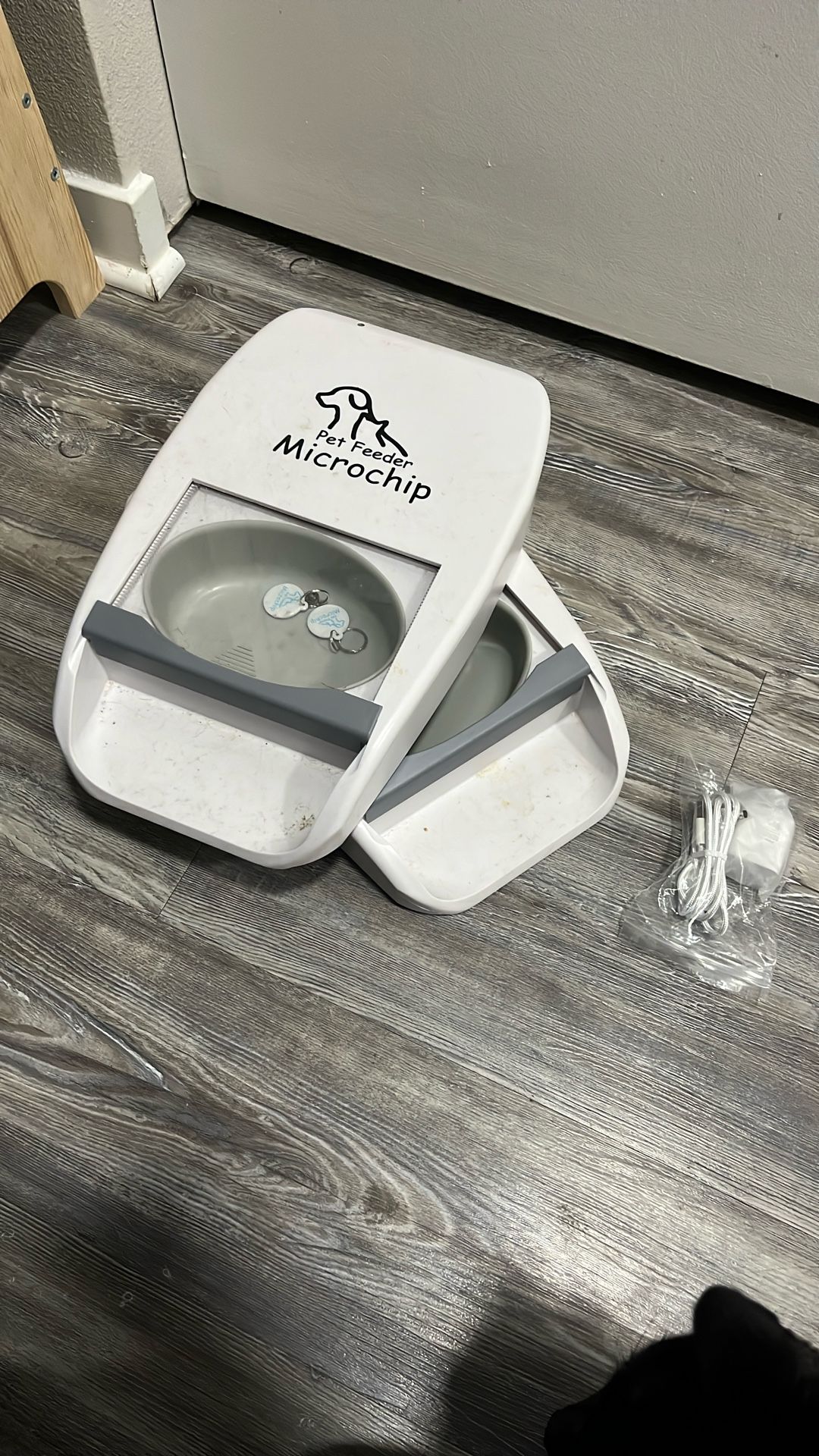 $60 for both or $35 each. (Photos were taken before they were cleaned.) DC power or battery power. Microchips are worn on the collar and activate the cover when held within 1-2” of the front of the bowl (not over the bowl), then after leaving the activation area, the bowl won’t activate again for one minute and proximity. Still have the boxes and instructions, and kept the original DC wires but have supplied better/newer DC that came with my new feeders. Each bowl comes with two microchips which can be added/deleted according to the instructions. I bought these because of the ability for multiple feeding times but I could never figure out the “clock”, which they don’t seem to have, so I just left them on free-feed/specific microchip proximity. I got different feeders because I couldn’t always add food on a schedule for my one cat on a diet. My other cat regulated her own feeding so I could keep 2 cups of kibble in the bowl.