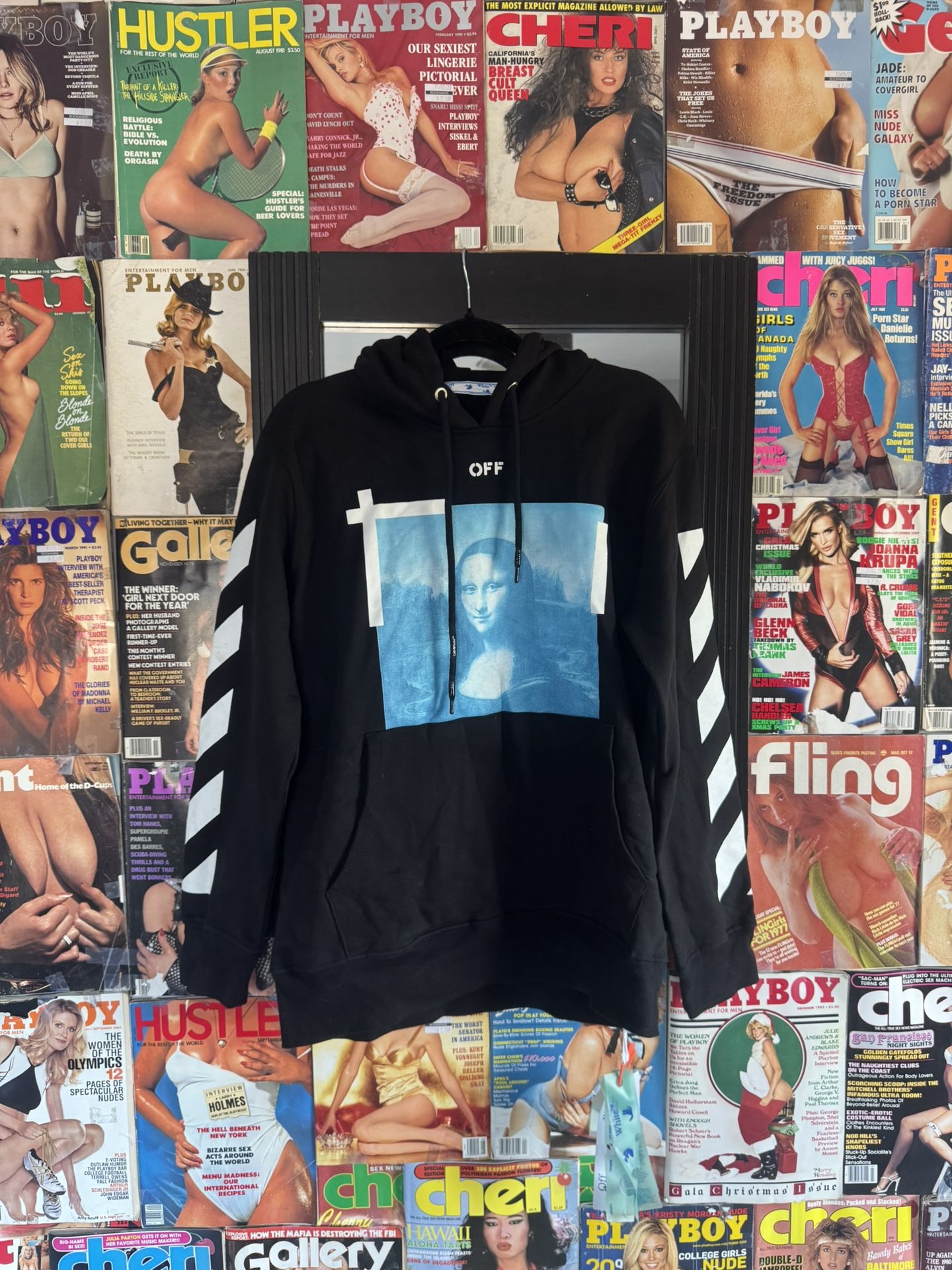 Off-White Blue Monalisa Over Hood 'Black' Brand New Size L Fits Like a Medium For reference I am 6”2 200 Was in storage for long time Off-White's Blue Monalisa Over Hood sweatshirt is named for the graphics of the famed Renaissance painting printed on the front and washed in blue. From the brand's Resort 2020 collection, the black layering piece features signature stripes on the sleeves and arrows on the back. #offwhite #hype #virgil #hoodie #streetwear blue graphic, oversized hoodie, streetwear, signature stripes, renaissance print, black layering, luxury street, designer hoodie, modern art design, casual athleisure