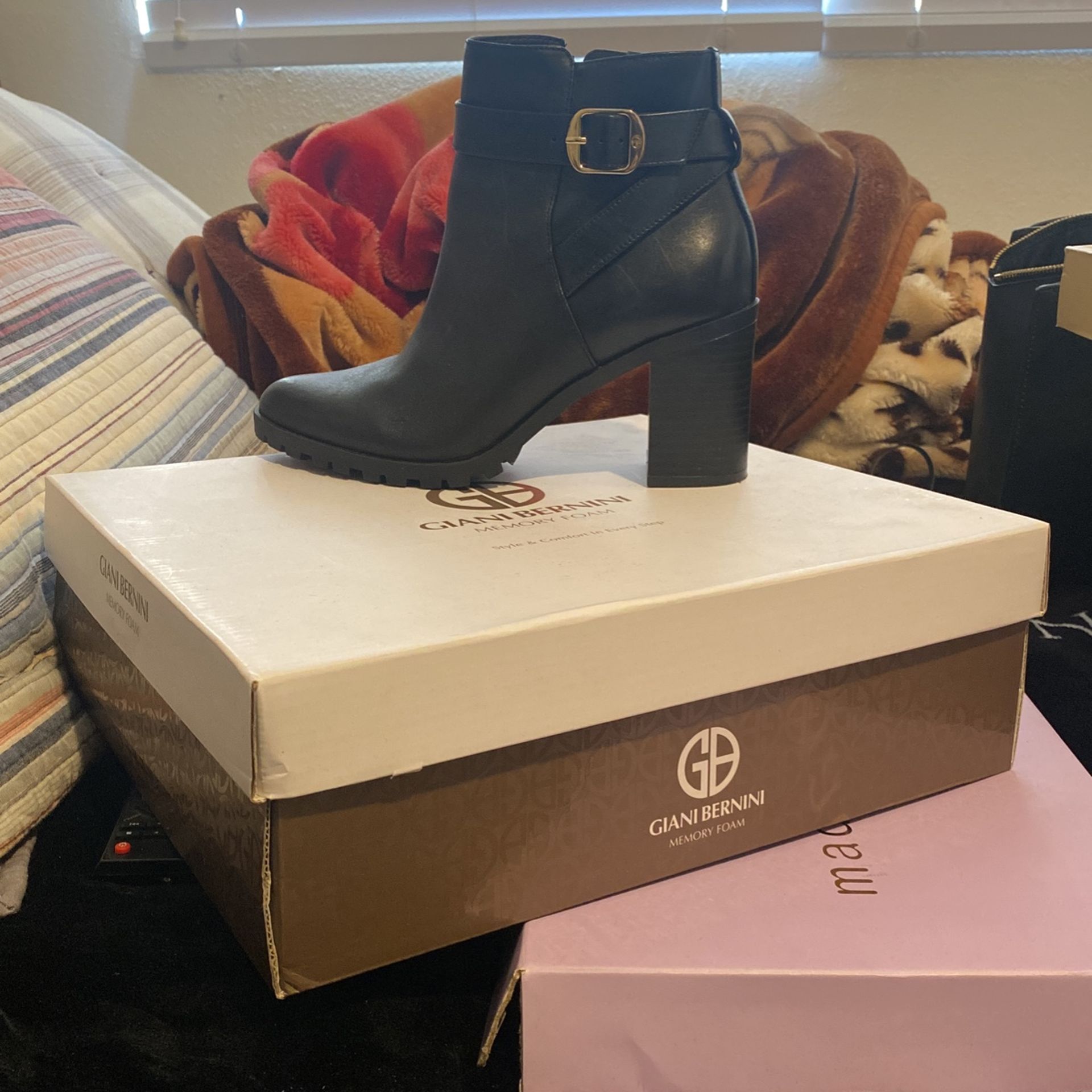 Lightly used Leather black booties Zipper Cute buckle for aesthetic Memory foam inside, Super comfy. In original box OBO Meet up (: