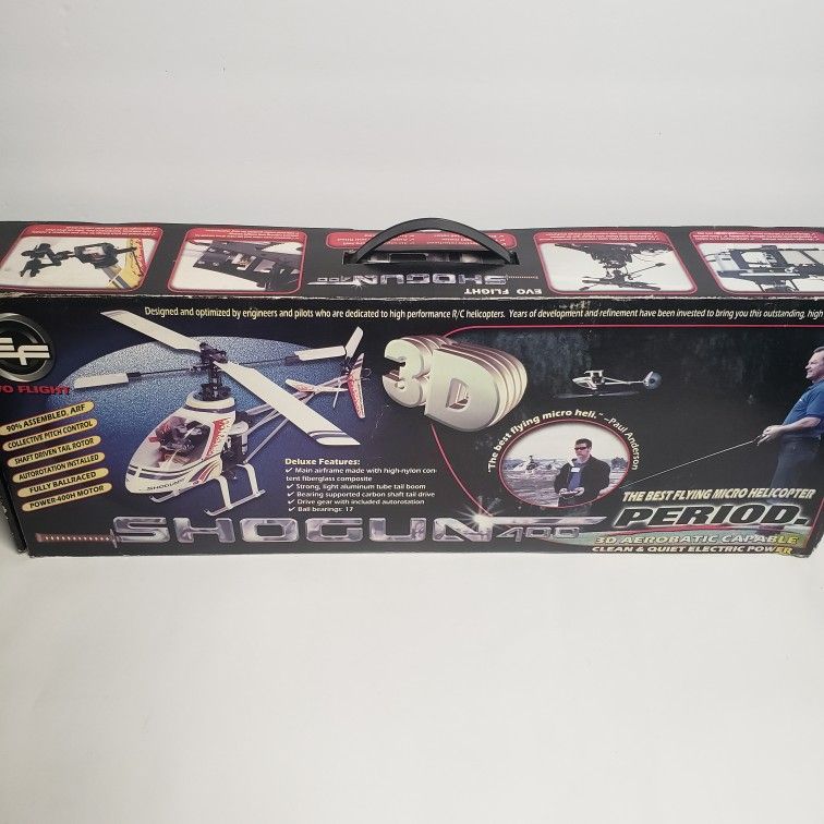 Experience the thrill of flying with the Shogun 400 Evo Flight Helicopter. This 1:10 scale model is made with high-quality carbon fiber material and comes with a set of new carbon fiber propellers. The multi-color helicopter is perfect for aerobatic and 3D flights and requires almost no assembly. This hobby grade model is ideal for radio control and control line enthusiasts. The electric fuel type ensures quiet and efficient flights. Get ready for an exciting adventure in the skies with the Shogun 400 Evo Flight Helicopter. New Open Box comes with what you see in photos view photos for more details on item condition and what's all included with purchase. Brand new carbon fiber blades Propellers Original value of $69.99 included with purchase