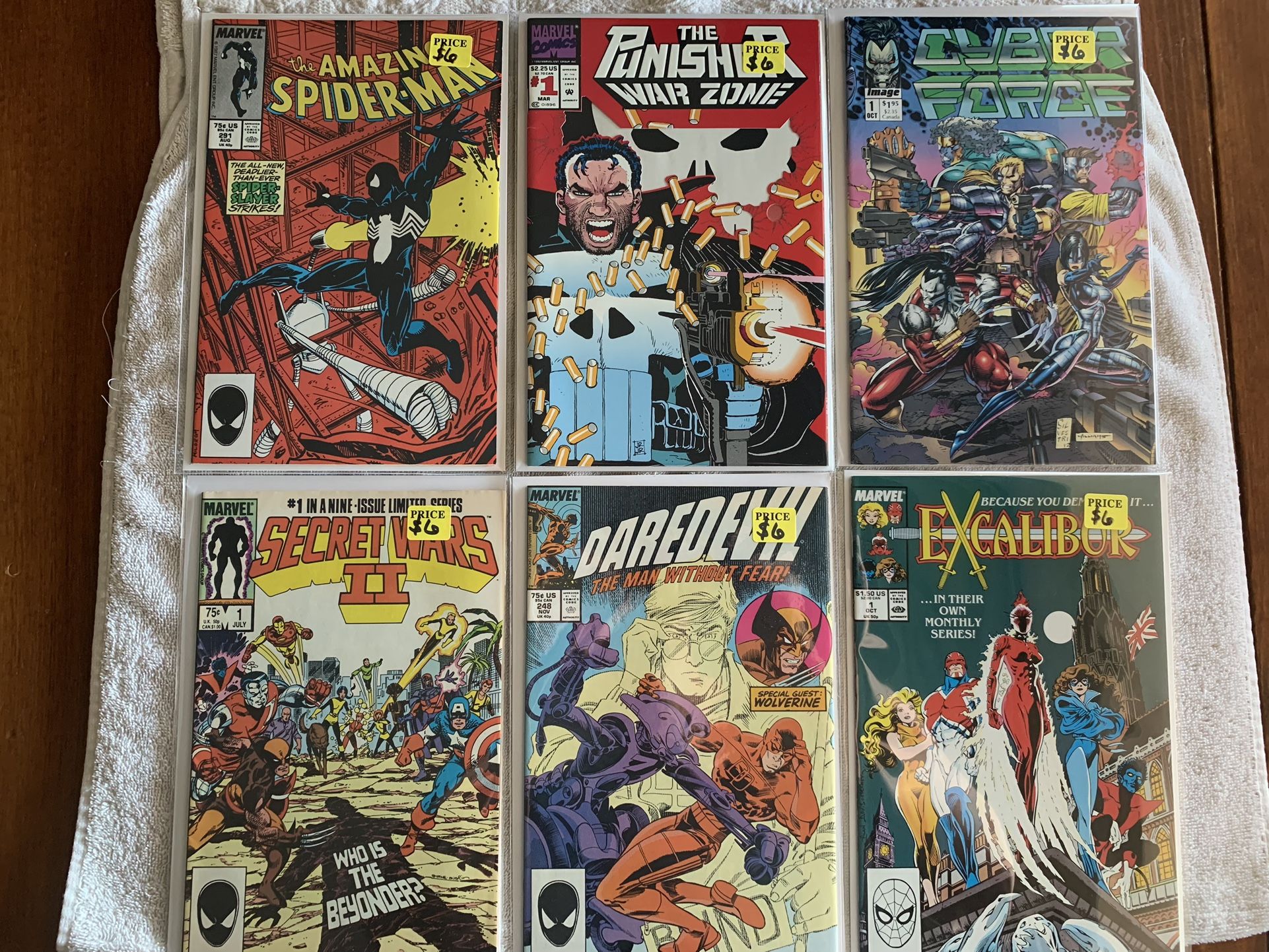 Items up for sale are some comic books that I’m selling. They are all in Good condition as you can see in the pictures! All comic books are in a new resealable Polypropylene clear bag with white board. I’m asking $20 for everything or you can buy the items individually. Price is listed for $6 per comic book. Items below are what I’m selling!!! (Marvel) Amazing Spider-man #291 (Marvel) Cyber Force #1 (Marvel) Secret Wars II #1 (Marvel) Daredevil #248 (Marvel) Excalibur #1 I'm also willing to do Trade Deals as well. *See attached pictures of the condition and for more information about these items.