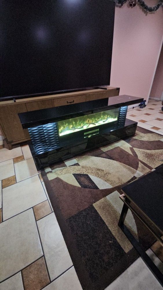 NEW LUXURY FIREPLACE AND TV STAND MIRRORED BLACK AND WHITE AVAILABLE FIT TV 100" NEON LIGHTS CONTROL,BLUETOOTH, SPEAKERS, SIMULATOR FIRE,HEATER, 71"16
