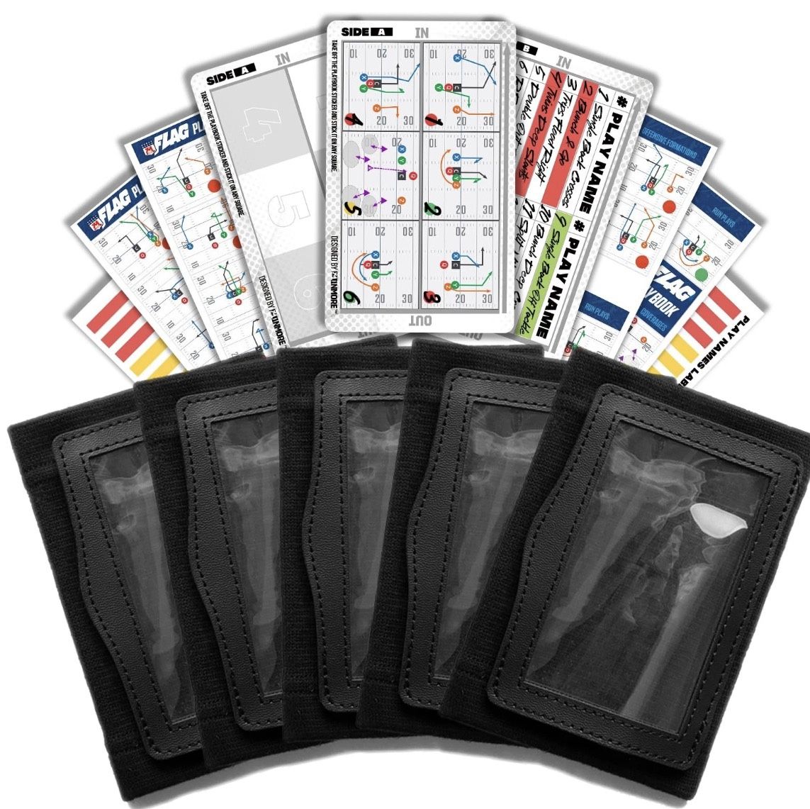 5 pack Each of our wrist bands comes with a playbook system that includes 43 common 5v5 flag football play stickers (covering offense, defense, and special teams) and 3 PVC play name cards. You can choose any tactic, peel off the play sticker, and directly stick it onto the card (up to 6 per card), allowing for quick and accurate use during the game. The back of the card supports handwritten play names, and you can use our provided colored stripe stickers to distinguish between tactics. we chose a flat-stitch fabric for better elasticity and durability, a more transparent and clear PVC window, and a thicker PU material. The tighter stitching can withstand the pulls and tugs of the game, and with our cards and stickers, the wristband's lifespan is significantly extended