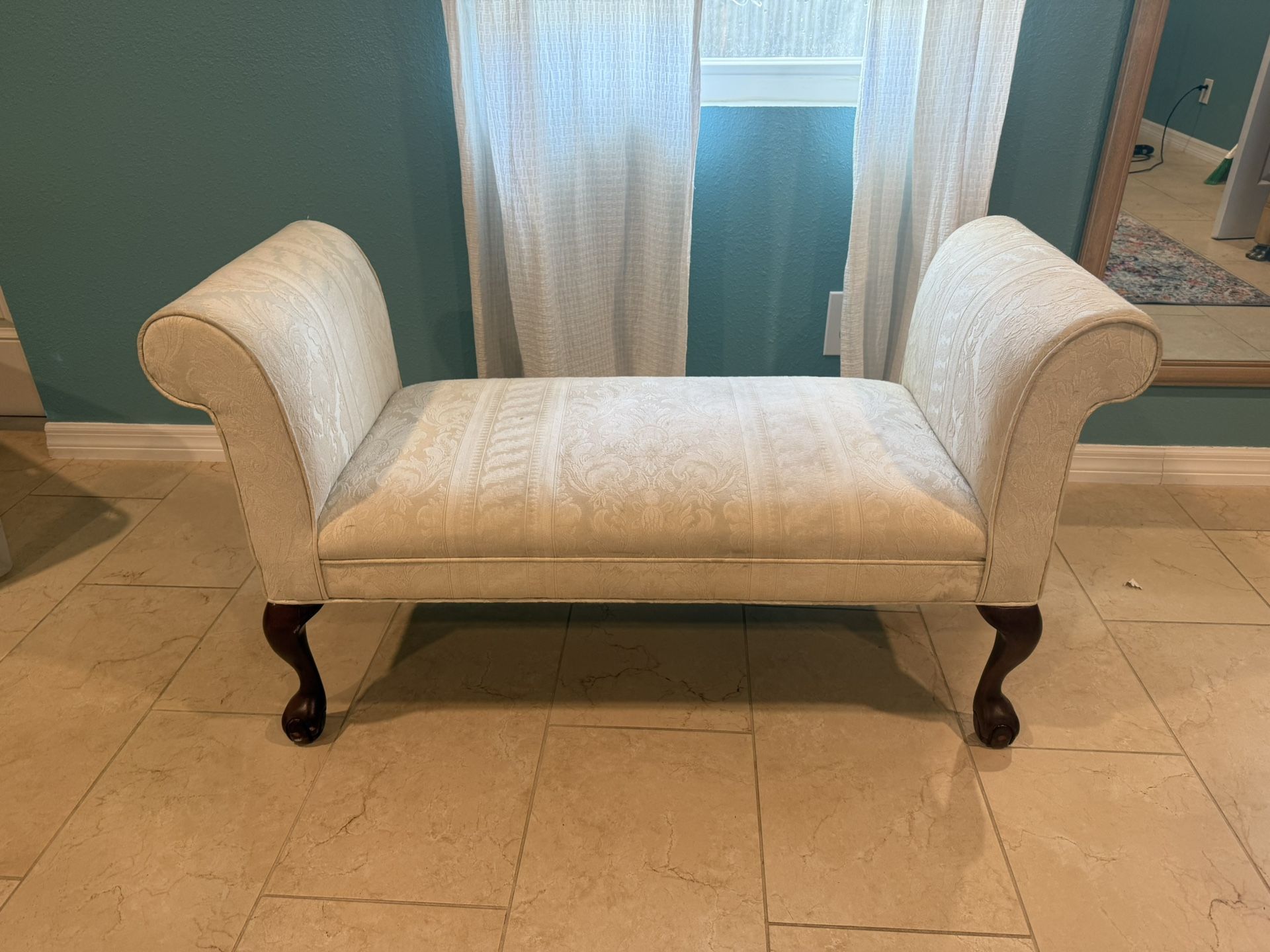 Cream fabric wooden legs. 45 inches long and 25 inches high ( by arms)