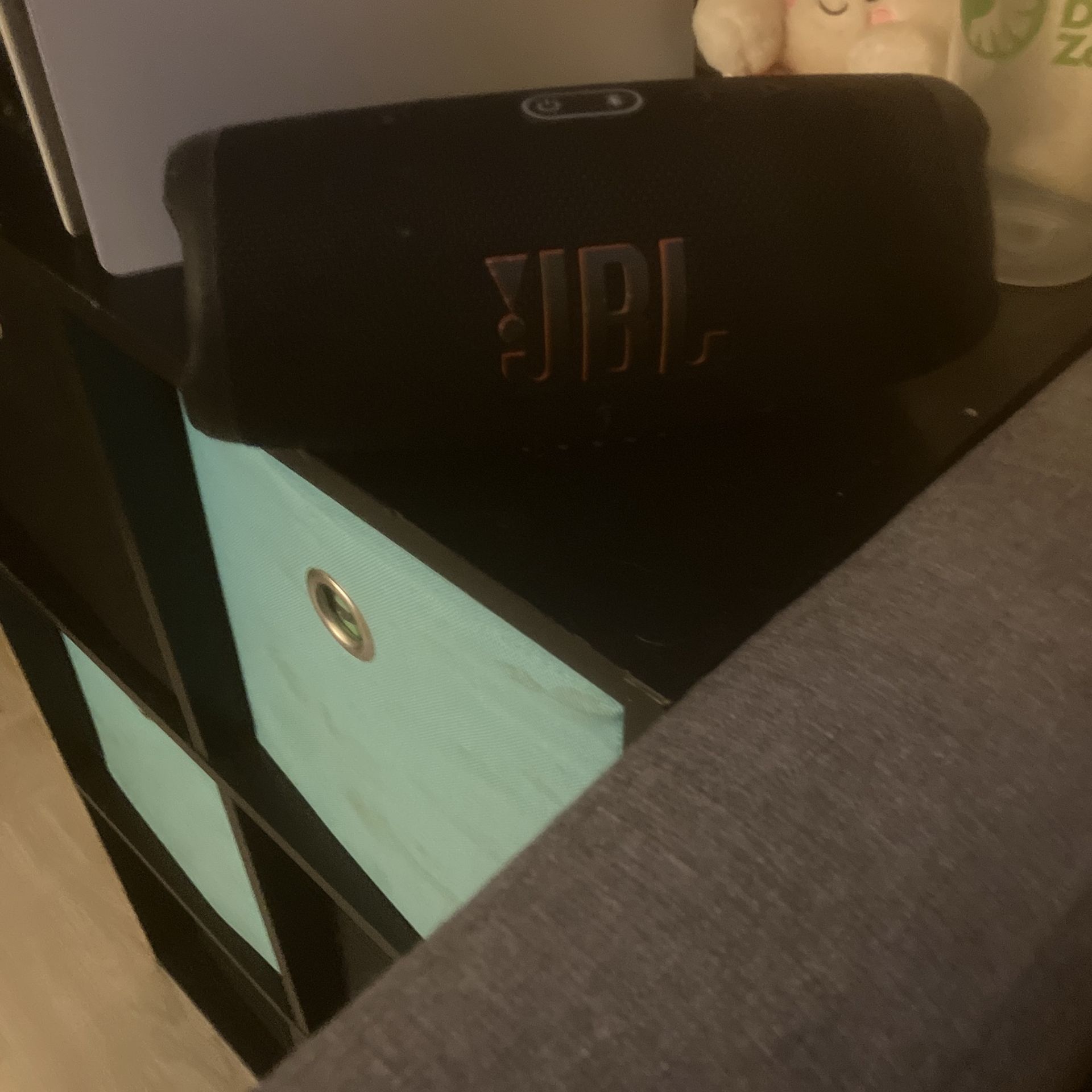Black jbl speaker with a charger port. The volume is clear and can get pretty loud. still in good condition