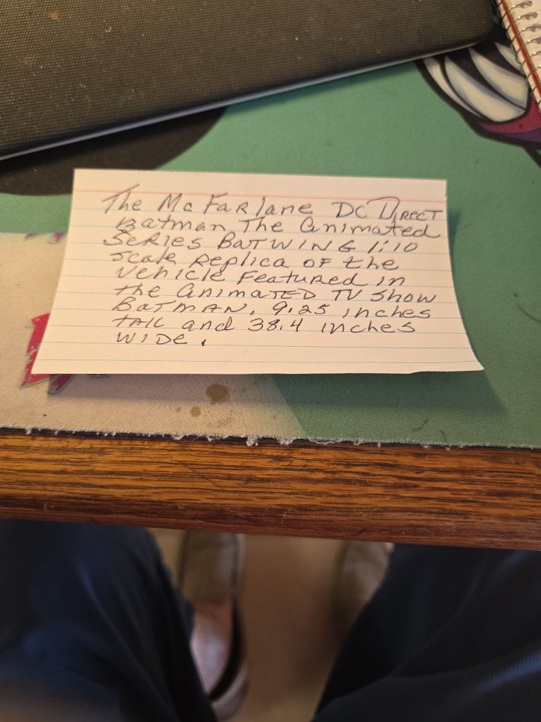 This is a sealed McFarlane DC Direct Batman the animated series Batwing 1:20 scale replica of the vehicle featured in the animated TV show Batman. It is 9.25 inches tall and 38.4 inches wide. We are asking $80 firm. We are off 104th drive and Northern in Peoria.