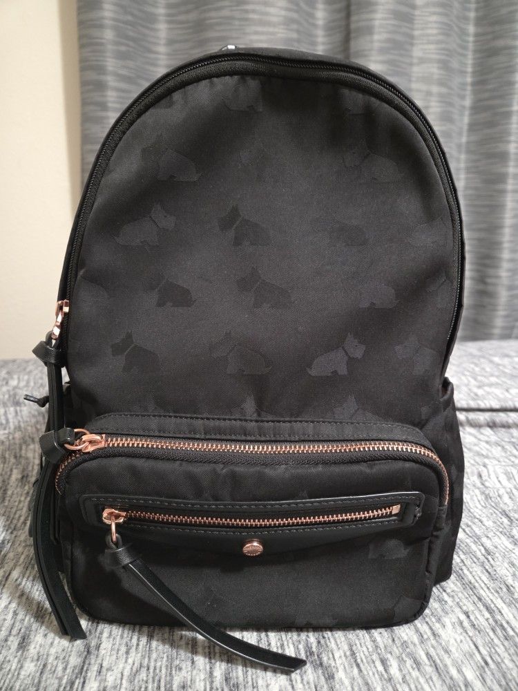 RADLEY London SMALL polyester backpack 12” top zip in black rose gold hardware. Perfect small backpack for running every day errands. Running errands and looking stylish has never been easier to accomplish. Perfect for field trips, summer vacation to carry all your must haves. Has convenient pockets inside amd outside to carry your phone charger and beats or whatever gadgets you need. Easy to access pockets on the sides for a drinks. If you love dogs this is for you! I received many compliments everywhere I went. Radley London Rose gold hardware 12” top to bottom 9” side to side 6” deep Adjustable back straps Top handle Side pockets Backside concealed pocket Front zip pockets Inner zip and non zip pockets Clean lining Smoke free home Hablo español Pick up ONLY 92503 area CASH ONLY Message when ready to pick up to send address. SERIOUS BUYERS ONLY. DONT WASTE YOUR TIME AS WELL AS MINE. THANK YOU.