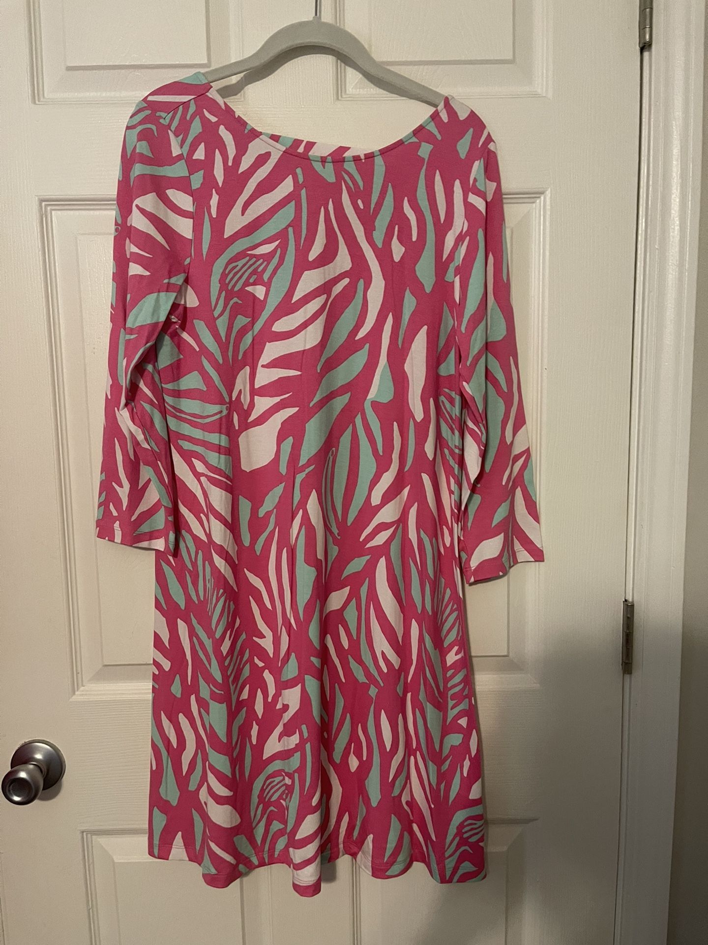Pink background with aqua and white designs 96% rayon 4% spandex Never worn Size L V back line with horizontal straps I have plenty of dresses that can be bundled for 5$ each if you take more than 5. All dresses are in fabulous condition.