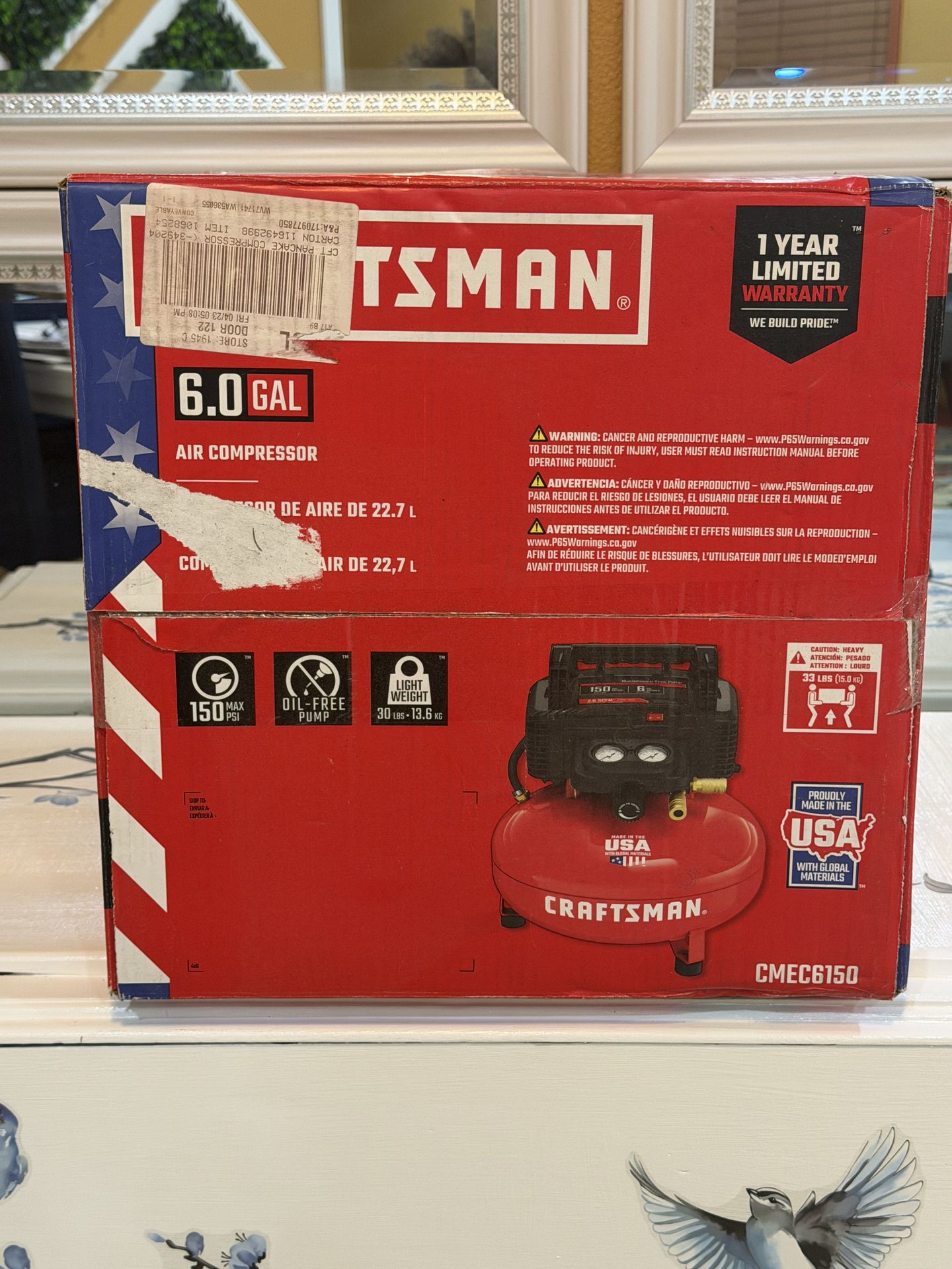 CRAFTSMAN 6-Gallon Portable Electric 150 PSI Pancake Air Compressor (Model: CMEC6150) * Tank Capacity: 6 gallons. * Max Pressure: 150 PSI. * Pump Design: Durable, maintenance-free, oil-free pump. * Portability: Lightweight at approximately 30 lbs with an integrated handle. This item was purchased several years ago but never used. The book remains unopened.