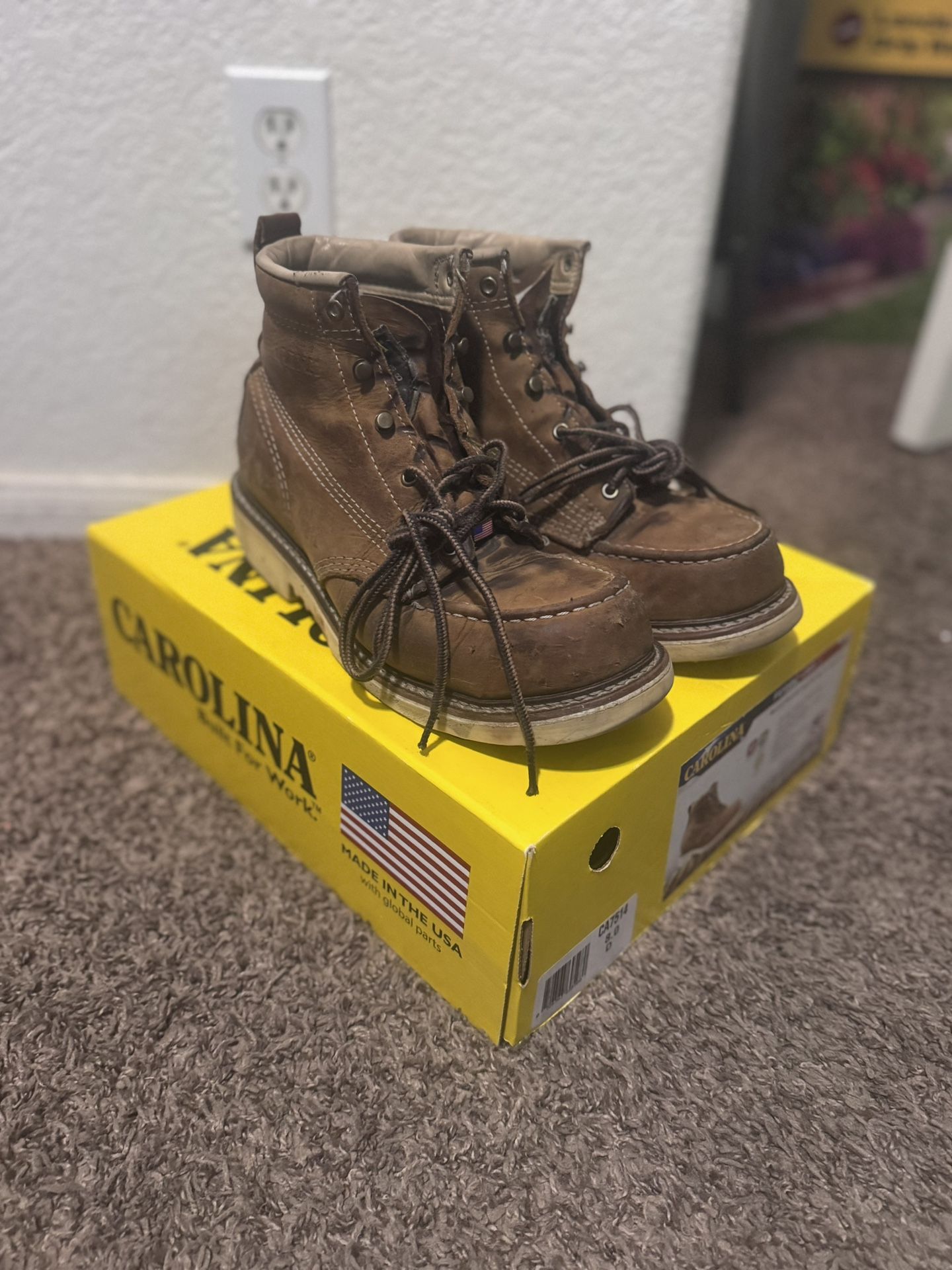 Used Carolina work boots. Size is 8D. Has Carhartt insoles. Steel toe. Comes with original box. In Jurupa Valley $50