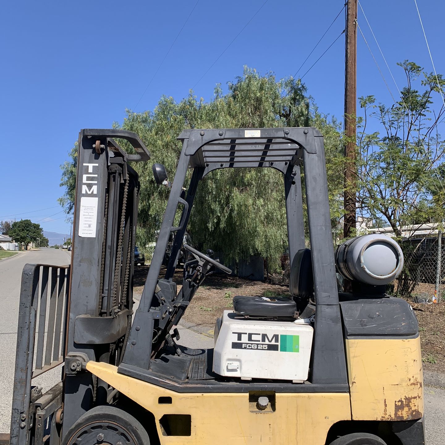 TCM forklift 5000lbs 2 stage mast side shift Low hours only 3k hours Automatic transmission 4 cylinder engine propane powered Runs and drives great Original paint original seat Located in jurupa Valley California