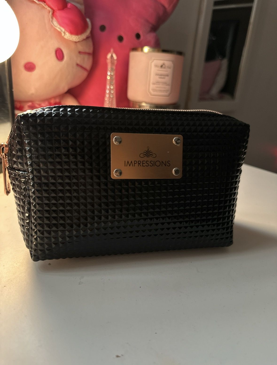 This is an Impressions Vanity Raven large cosmetic bag in black patent leather with rose gold accents. Maturely appreciated, with much love to still offer.