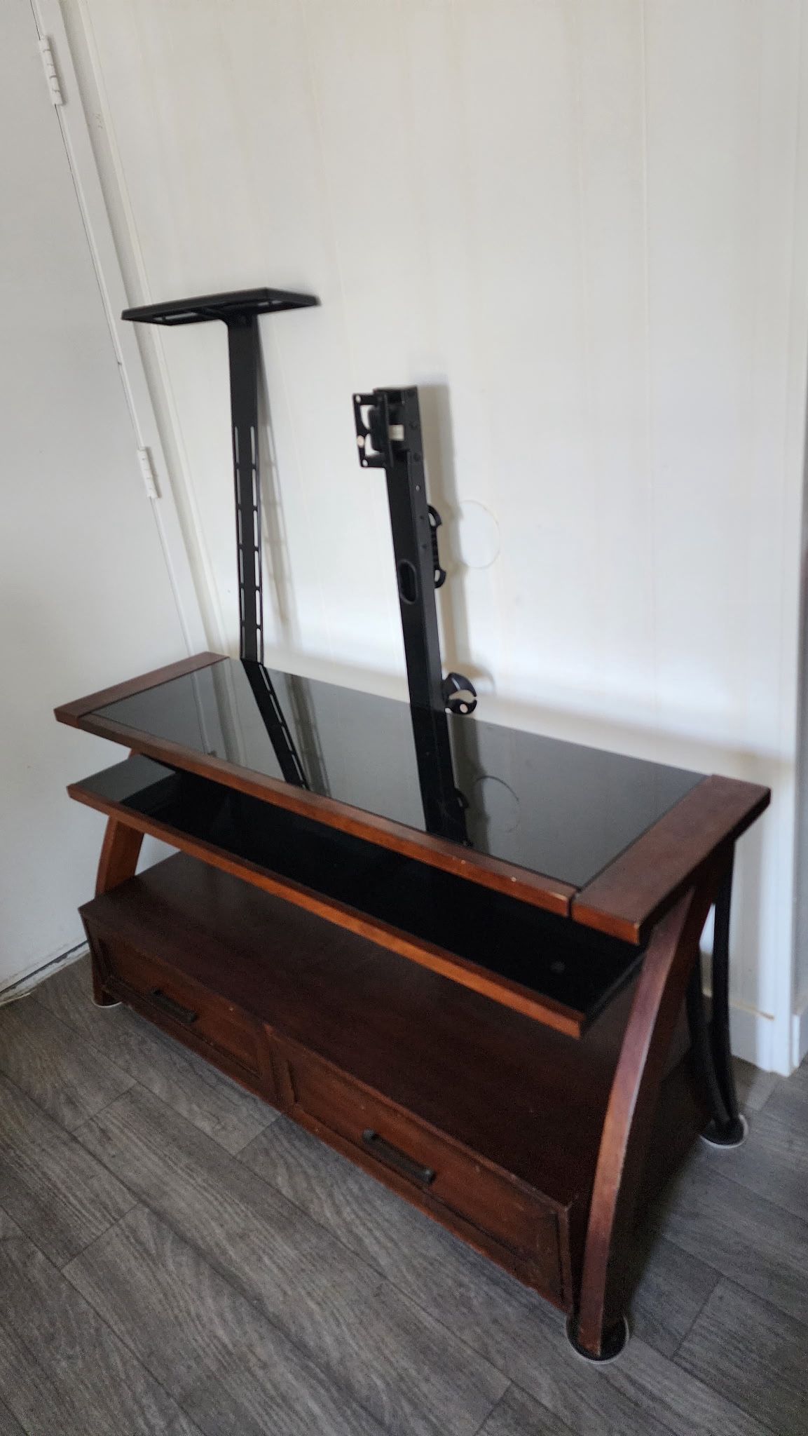 Sleek wood and black glass TV stand with built-in TV mount Includes media shelf, 2 storage drawers, and cable management. Dimensions: 4 ft 5 in (L) x 27 in (H) Pick up only