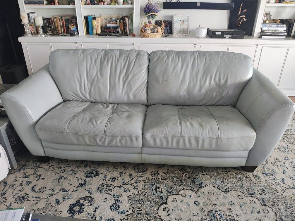 Blue leather couch, Fred to a goodhome. One spot very worn rest is very good see pictures must be able to pick up in Boca Raton