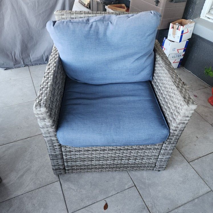 5 piece patio Wicker set, 4 steady chairs, 1 swivel. The swivel one have some damage as shown on picture. OBO.